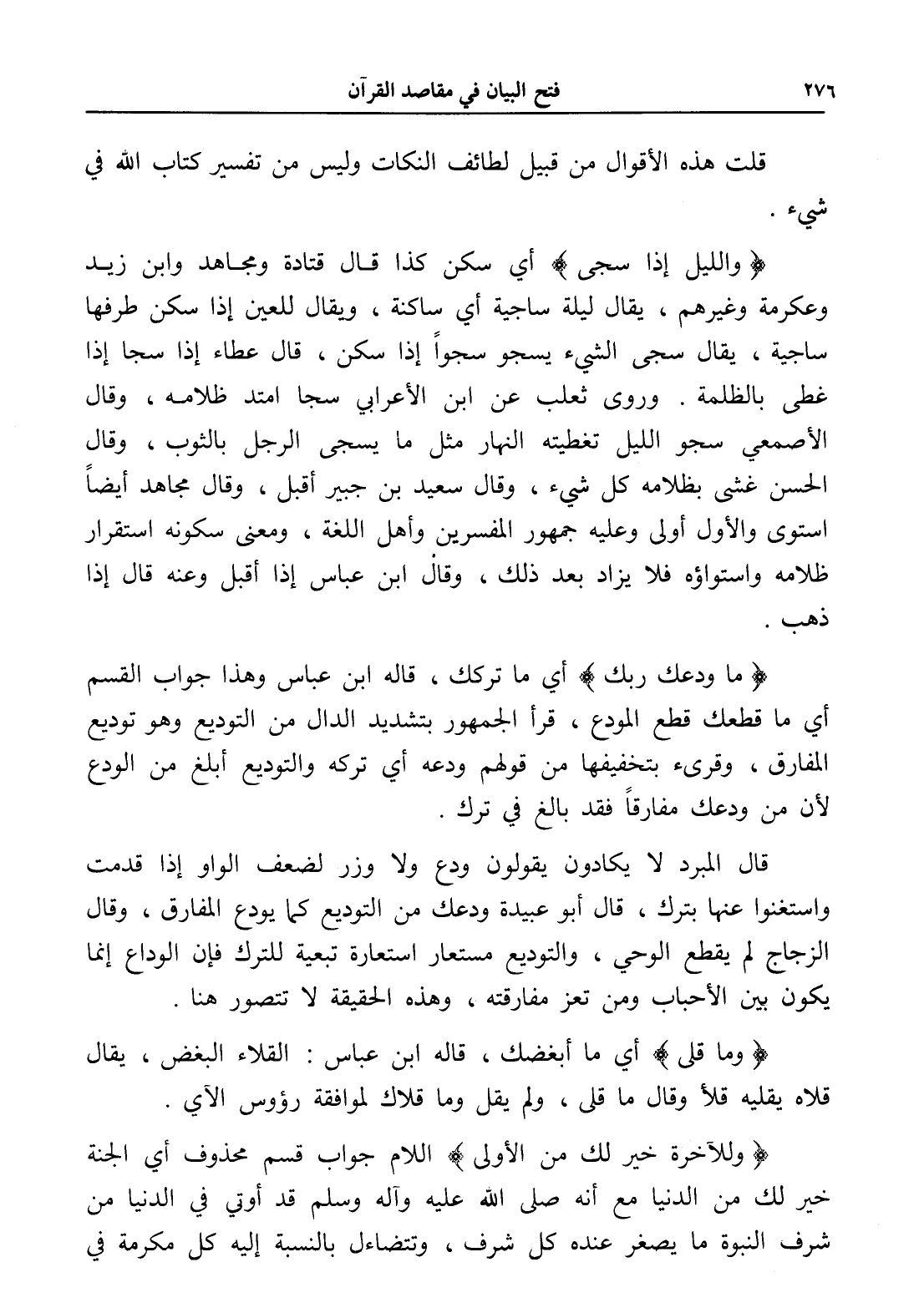 (والليل إذا سجى) أي سكن كذا قال قتادة ومجاهد وابن زيد وعكرمة وغيرهم، يقال ليلة ساجية أي ساكنة، ويقال للعين إذا سكن طرفها ساجية، يقال سجى الشيء يسجو سجواً إذا سكن، قال عطاء إذا سجا إذا غطى بالظلمة. وروى ثعلب عن ابن الأعرابي سجا امتد ظلامه، وقال الأصمعي سجو الليل تغطيته النهار مثل ما يسجى الرجل بالثوب، وقال الحسن غشى بظلامه كل شيء، وقال سعيد بن جبير أقبل، وقال مجاهد أيضاًً استوى والأول أولى وعليه جمهور المفسرين وأهل اللغة، ومعنى سكونه استقرار ظلامه واستواؤه فلا يزاد بعد ذلك، وقال ابن عباس إذا أقبل وعنه قال إذا ذهب.