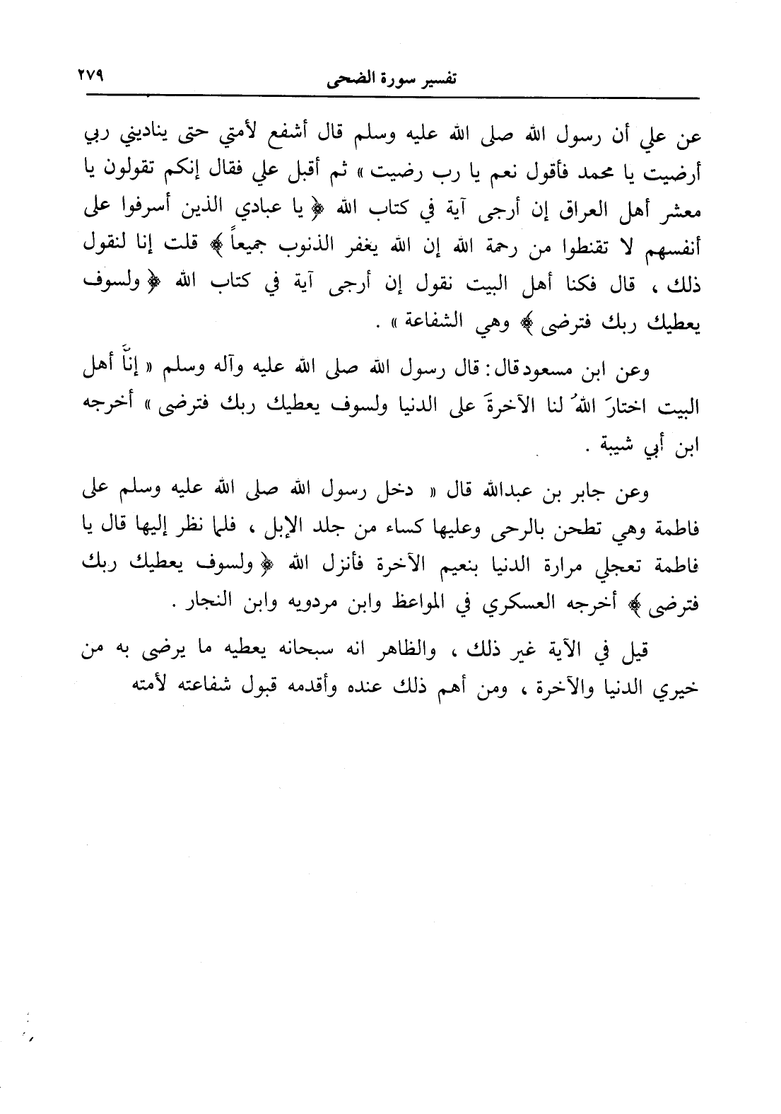 عن علي أن رسول الله صلى الله عليه وسلم قال أشفع لأمتي حتى يناديني ربي أرضيت يا محمد فأقول نعم يا رب رضيت " ثم أقبل علي فقال إنكم تقولون يا معشر أهل العراق إن أرجى آية في كتاب الله (يَا عِبَادِيَ الَّذِينَ أَسْرَفُوا عَلَى أَنْفُسِهِمْ لَا تَقْنَطُوا مِنْ رَحْمَةِ اللَّهِ إِنَّ اللَّهَ يَغْفِرُ الذُّنُوبَ جَمِيعًا) قلت إنا لنقول ذلك، قال فكنا أهل البيت نقول إن أرجى آية في كتاب الله (ولسوف يعطيك ربك فترضى) وهي الشفاعة ".