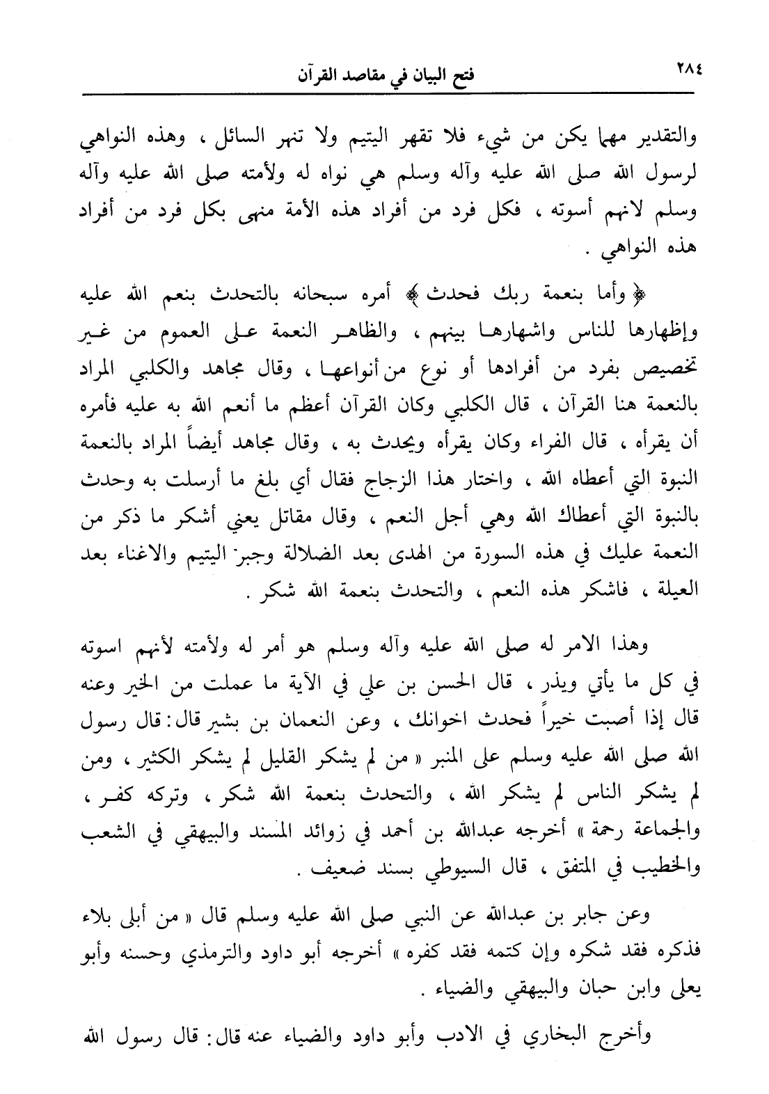 وهذا الأمر له صلى الله عليه وآله وسلم هو أمر له ولأمته لأنهم اسوته في كل ما يأتي ويذر، قال الحسن بن علي في الآية ما عملت من الخير وعنه قال إذا أصبت خيراً فحدث إخوانك، وعن النعمان بن بشير قال: قال رسول الله صلى الله عليه وسلم على المنبر " من لم يشكر القليل لم يشكر الكثير، ومن لم يشكر الناس لم يشكر الله، والتحدث بنعمة الله شكر، وتركه كفر، والجماعة رحمة " أخرجه عبد الله بن أحمد في زوائد المسند والبيهقي في الشعب والخطيب في المتفق، قال السيوطي بسند ضعيف.