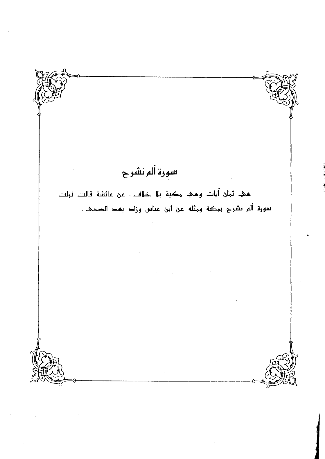 هي ثمان آيات وهي مكية بلا خلاف، عن عائشة قالت نزلت سورة ألم نشرح بمكة ومثله عن ابن عباس وزاد بعد الضحى.