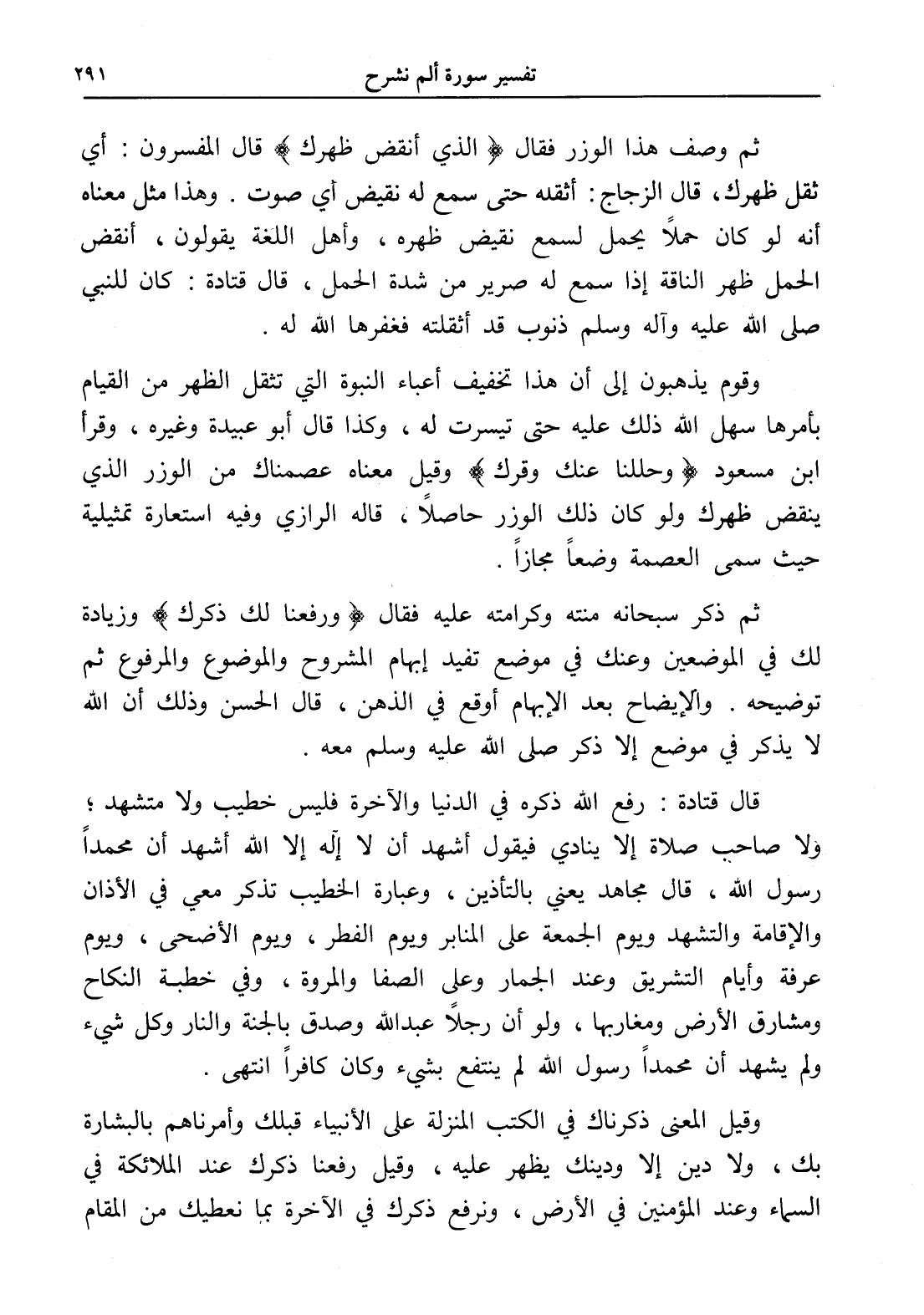 قال قتادة: رفع الله ذكره في الدنيا والآخرة فليس خطيب ولا متشهد؛ ولا صاحب صلاة إلا ينادي فيقول أشهد أن لا إله إلا الله أشهد أن محمداً رسول الله، قال مجاهد يعني بالتأذين، وعبارة الخطيب تذكر معي في الأذان والإقامة والتشهد ويوم الجمعة على المنابر ويوم الفطر، ويوم الأضحى، ويوم عرفة وأيام التشريق وعند الجمار وعلى الصفا والمروة، وفي خطبة النكاح ومشارق الأرض ومغاربها، ولو أن رجلاً عبد الله وصدق بالجنة والنار وكل شيء ولم يشهد أن محمداً رسول الله لم ينتفع بشيء وكان كافراً انتهى.