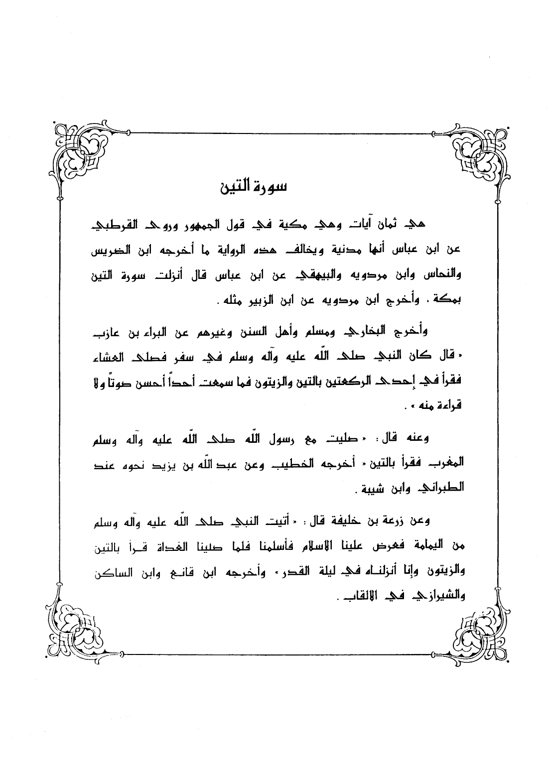 هي ثمان آيات وهي مكية في قول الجمهور وروى القرطبي عن ابن عباس أنها مدنية ويخالف هذه الرواية ما أخرجه ابن الضريس والنحاس وابن مردويه والبيهقي عن ابن عباس قال أنزلت سورة التين بمكة، وأخرج ابن مردويه عن ابن الزبير مثله.