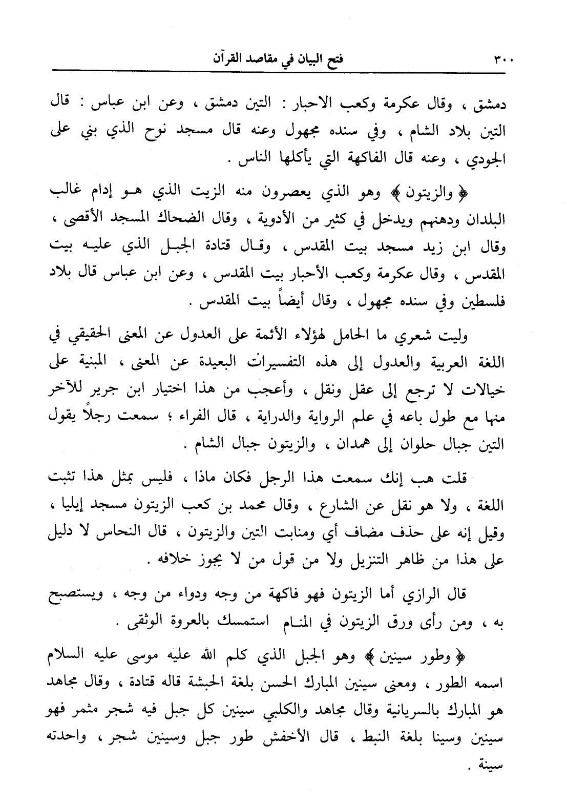 وليت شعري ما الحامل لهؤلاء الأئمة على العدول عن المعنى الحقيقي في اللغة العربية والعدول إلى هذه التفسيرات البعيدة عن المعنى، المبنية على خيالات لا ترجع إلى عقل ونقل، وأعجب من هذا اختيار ابن جرير للآخر منها مع طول باعه في علم الرواية والدراية، قال الفراء؛ سمعت رجلاً يقول التين جبال حلوان إلى همدان، والزيتون جبال الشام.