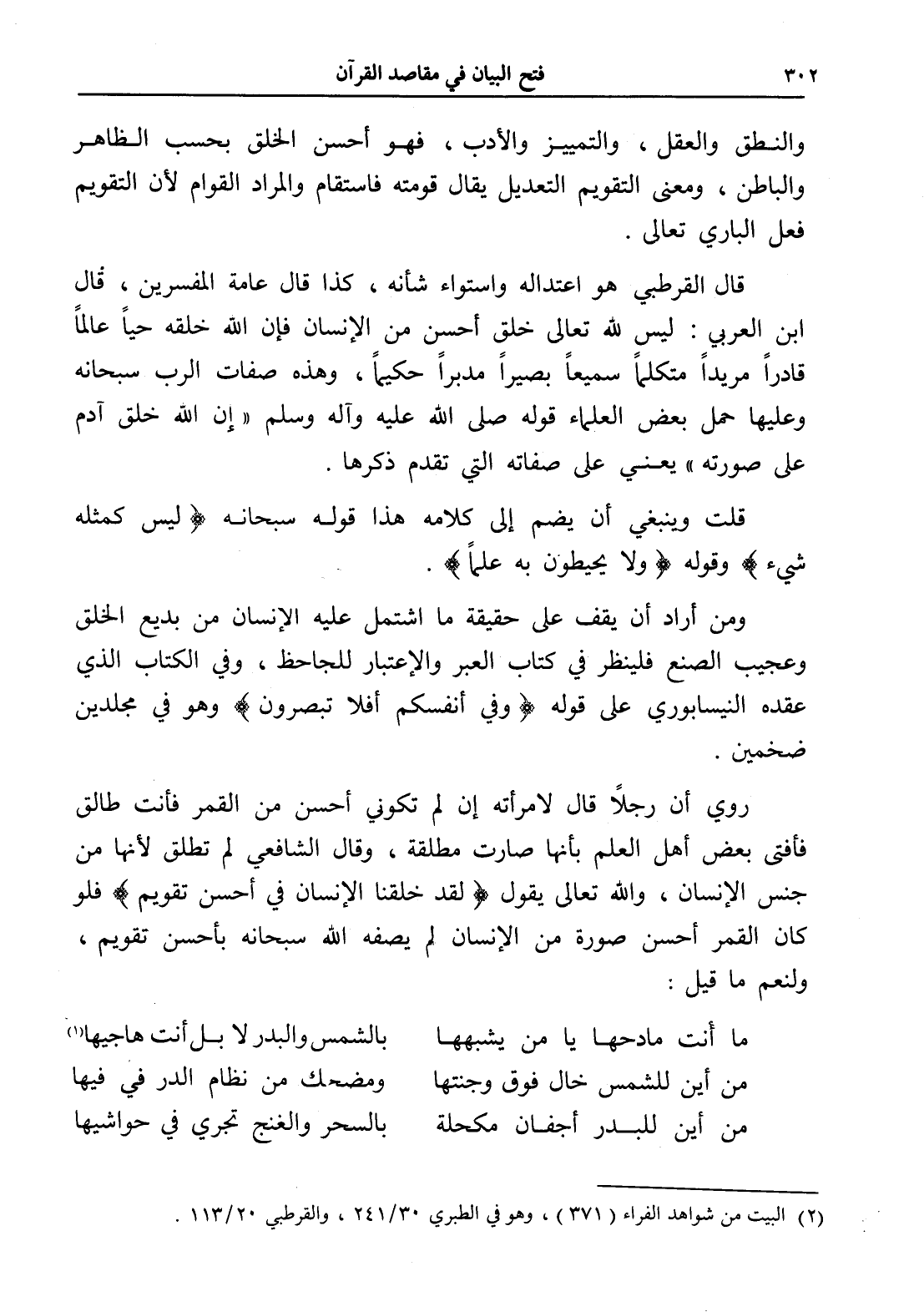 قال القرطبي هو اعتداله واستواء شأنه، كذا قال عامة المفسرين، قال ابن العربي: ليس لله تعالى خلق أحسن من الإنسان فإن الله خلقه حياً عالماً قادراً مريداً متكلماً سميعاً بصيراً مدبراً حكيماً، وهذه صفات الرب سبحانه وعليها حمل بعض العلماء قوله صلى الله عليه وآله وسلم " إن الله خلق آدم على صورته " يعني على صفاته التي تقدم ذكرها.