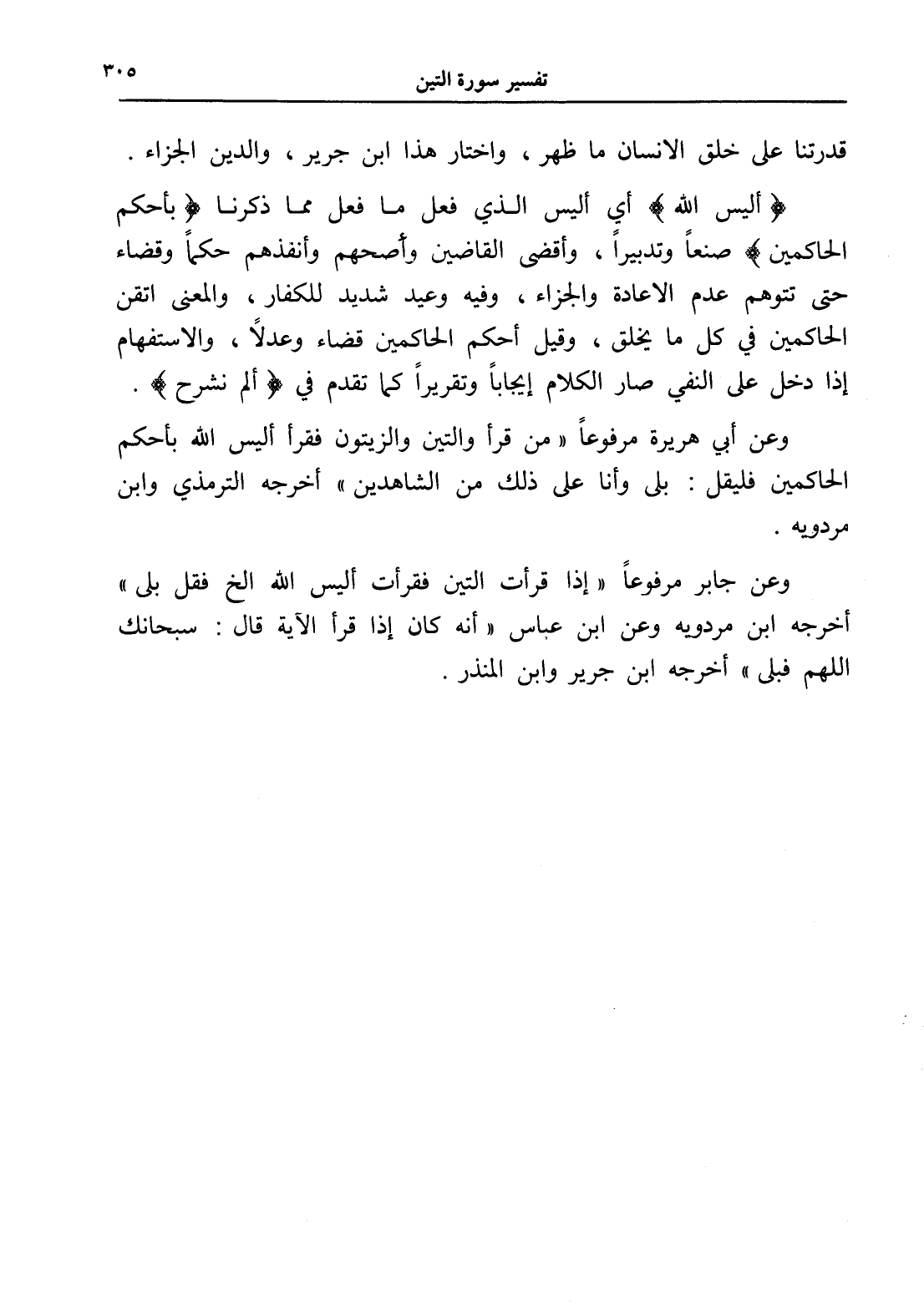 وعن أبي هريرة مرفوعاً " من قرأ والتين والزيتون فقرأ أليس الله بأحكم الحاكمين فليقل: بلى وأنا على ذلك من الشاهدين " أخرجه الترمذي وابن مردويه.