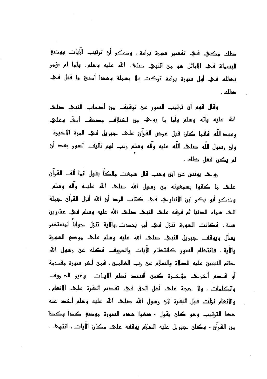 روى يونس عن ابن وهب قال سمعت مالكاً يقول إنما ألف القرآن على ما كانوا يسمعونه من رسول الله - صلى الله عليه وآله وسلم - وذكر أبو بكر ابن الأنباري في كتاب الرد أن الله أنزل القرآن جملة إلى سماء الدنيا ثم فرقه على النبي - صلى الله عليه وسلم - في عشرين سنة، فكانت السورة تنزل في أمر يحدث، والآية تنزل جواباً لمستخبر يسأل ويوقف جبريل النبي - صلى الله عليه وسلم - على موضع السورة والآية، فانتظام السور كانتظام الآيات والحروف فكله عن رسول الله خاتم النبيين عليه الصلاة والسلام عن رب العالمين، فمن أخر سورة مقدمة أو قدم أخرى مؤخرة كمن أفسد نظم الآيات، وغير الحروف والكلمات، ولا حجة على أهل الحق في تقديم البقرة على الأنعام، والأنعام نزلت قبل البقرة لأن رسول الله - صلى الله عليه وسلم - أخذ عنه هذا الترتيب وهو كان يقول " ضعوا هذه السورة موضع كذا وكذا من القرآن " وكان جبريل -عليه السلام- يوقفه على مكان الآيات، انتهى.