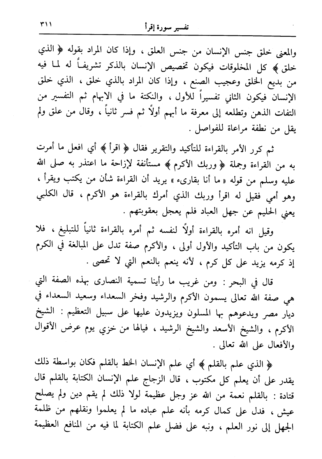 وقيل إنه أمره بالقراءة أولاً لنفسه ثم أمره بالقراءة ثانياً للتبليغ، فلا يكون من باب التأكيد والأول أولى، والأكرم صفة تدل على المبالغة في الكرم إذ كرمه يزيد على كل كرم، لأنه ينعم بالنعم التي لا تحصى.