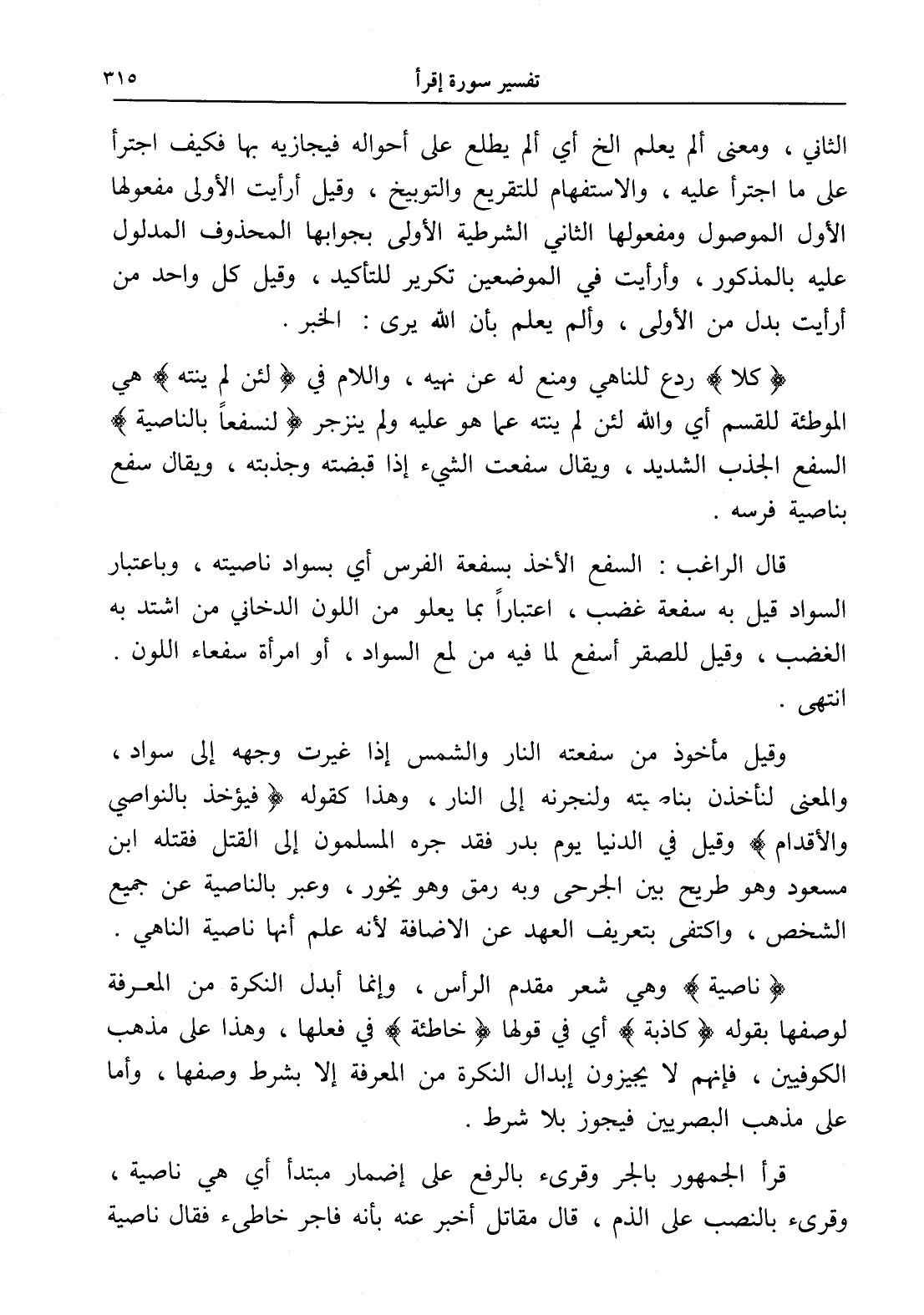 (كلا) ردع للناهي ومنع له عن نهيه، واللام في (لئن لم ينته) هي الموطئة للقسم أي والله لئن لم ينته عما هو عليه ولم ينزجر (لنسفعاً بالناصية) السفع الجذب الشديد، ويقال سفعت الشيء إذا قبضته وجذبته، ويقاك سفع بناصية فرسه.