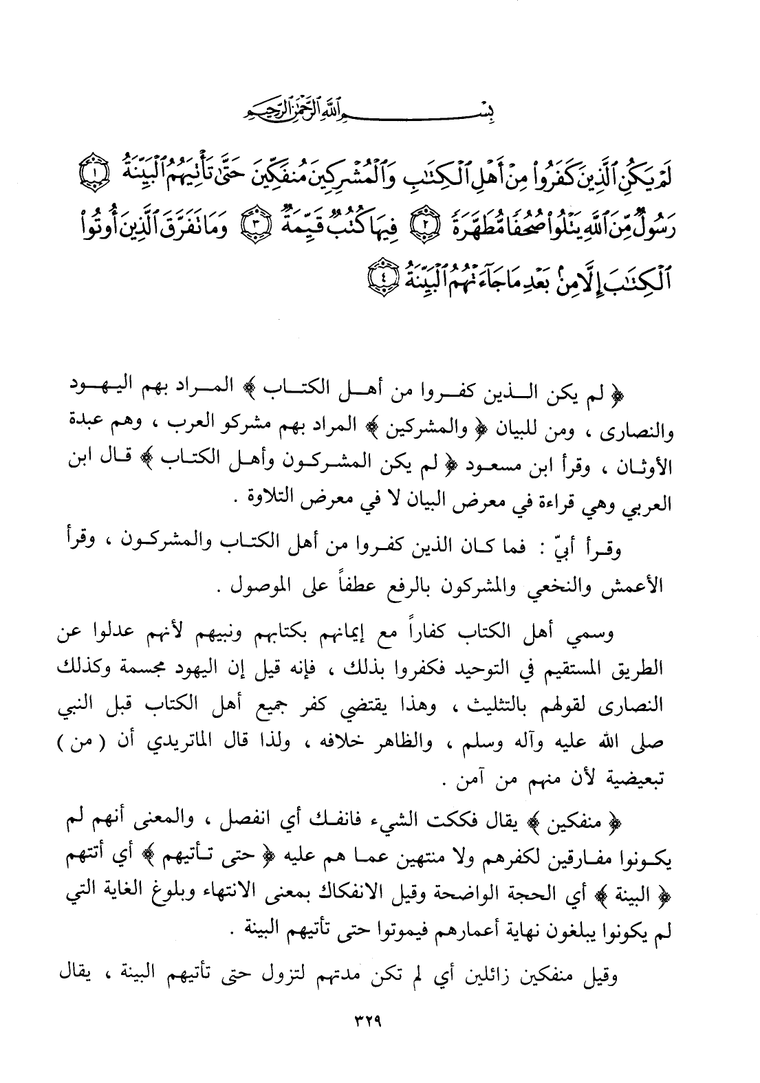 لَمْ يَكُنِ الَّذِينَ كَفَرُوا مِنْ أَهْلِ الْكِتَابِ وَالْمُشْرِكِينَ مُنْفَكِّينَ حَتَّى تَأْتِيَهُمُ الْبَيِّنَةُ (1) رَسُولٌ مِنَ اللَّهِ يَتْلُو صُحُفًا مُطَهَّرَةً (2) فِيهَا كُتُبٌ قَيِّمَةٌ (3) وَمَا تَفَرَّقَ الَّذِينَ أُوتُوا الْكِتَابَ إِلَّا مِنْ بَعْدِ مَا جَاءَتْهُمُ الْبَيِّنَةُ (4)