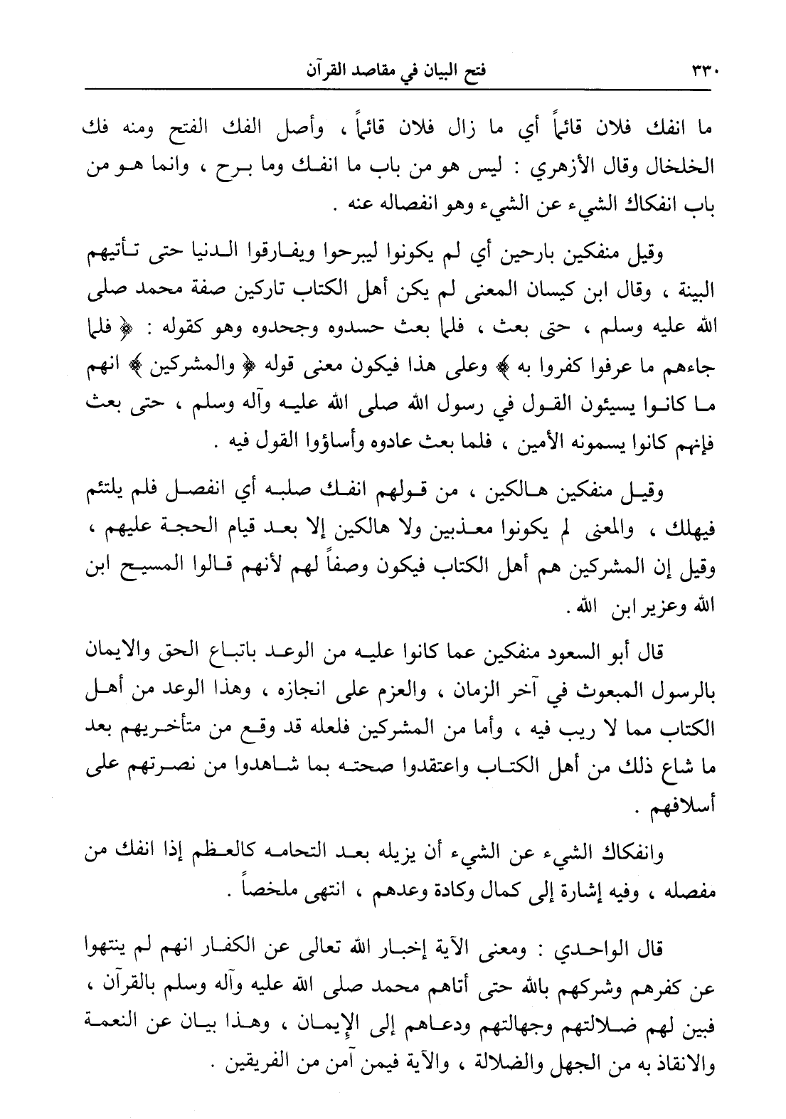 وقيل منفكين هالكين، من قولهم انفك صلبه أي انفصل فلم يلتئم فيهلك، والمعنى لم يكونوا معذبين ولا هالكين إلا بعد قيام الحجة عليهم، وقيل إن المشركين هم أهل الكتاب فيكون وصفاً لهم لأنهم قالوا المسيح ابن الله وعزير ابن الله.