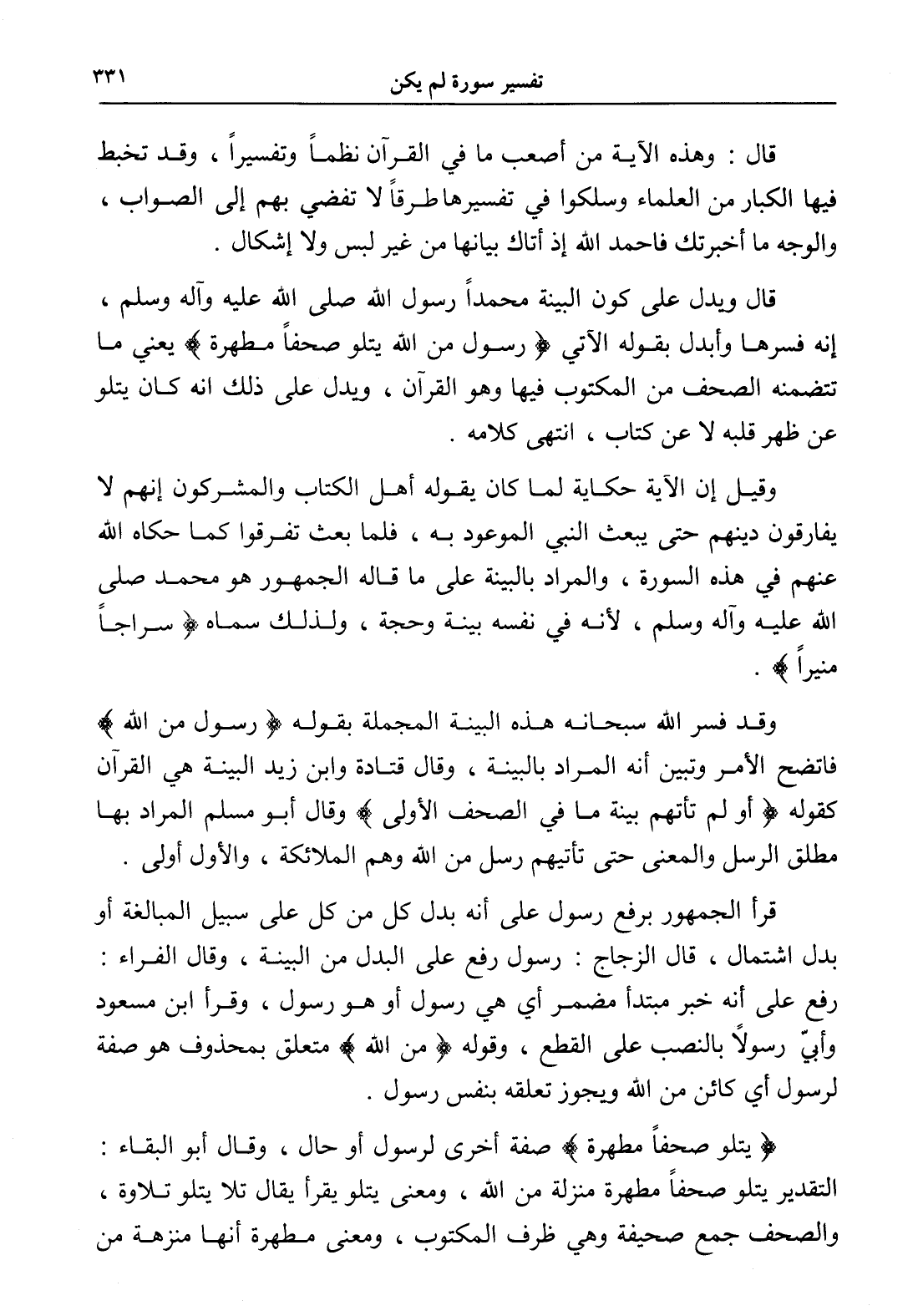 وقد فسر الله سبحانه هذه البينة المجملة بقوله (رسول من الله) فاتضح الأمر وتبين أنه المراد بالبينة، وقال قتادة وابن زيد البينة هي القرآن كقوله (أَوَلَمْ تَأْتِهِمْ بَيِّنَةُ مَا فِي الصُّحُفِ الْأُولَى) وقال أبو مسلم المراد بها مطلق الرسل والمعنى حتى تأتيهم رسل من الله وهم الملائكة، والأول أولى.