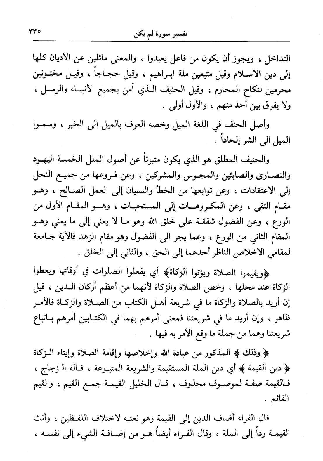قال الفراء أضاف الدين إلى القيمة وهو نعته لاختلاف اللفظين، وأنث القيمة رداً إلى الملة، وقال الفراء أيضاًً هو من إضافة الشيء إلى نفسه،