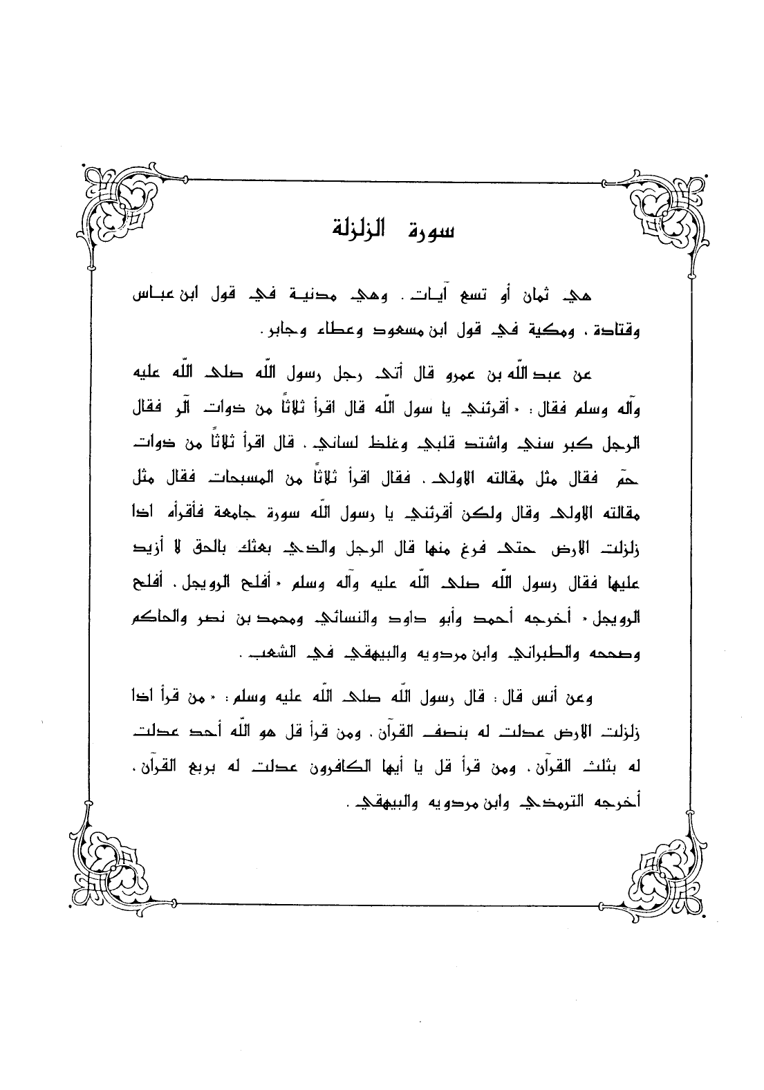 عن عبد الله بن عمرو قال أتى رجل رسول الله - صلى الله عليه وآله وسلم - فقال: أقرئني يا رسول الله قال: " اقرأ ثلاثاً من ذوات الر فقال الرجل كبر سني واشتد قلبي وغلظ لساني، قال " اقرأ ثلاثاً من ذوات حم " فقال مثل مقالته الأولى، فقال " اقرأ ثلاثاً من المسبحات " فقال مثل مقالته الأولى وقال ولكن أقرئني يا رسول الله سورة جامعة فأقرأه إذا زلزلت الأرض حتى فرع منها قال الرجل والذي بعثك بالحق لا أزيد عليها فقال رسول الله - صلى الله عليه وآله وسلم - " أفلح الرويجل، أفلح الرويجل " أخرجه أحمد وأبو داود والنسائي ومحمد بن نصر والحاكم وصححه والطبراني وابن مردويه والبيهقي في الشعب.