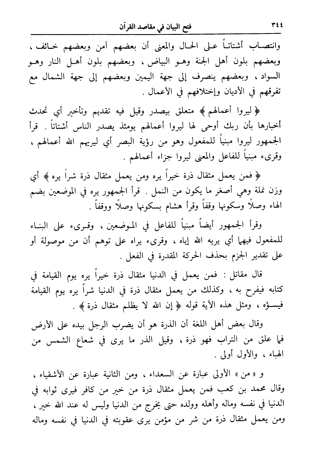 (فَمَنْ يَعْمَلْ مِثْقَالَ ذَرَّةٍ خَيْرًا يَرَهُ (7) وَمَنْ يَعْمَلْ مِثْقَالَ ذَرَّةٍ شَرًّا يَرَهُ) أي وزن نملة وهي أصغر ما يكون من النمل. قرأ الجمهور يره في الموضعين بضم الهاء وصلاً وسكونها وقفاً وقرأ هشام بسكونها وصلاً ووقفاً.