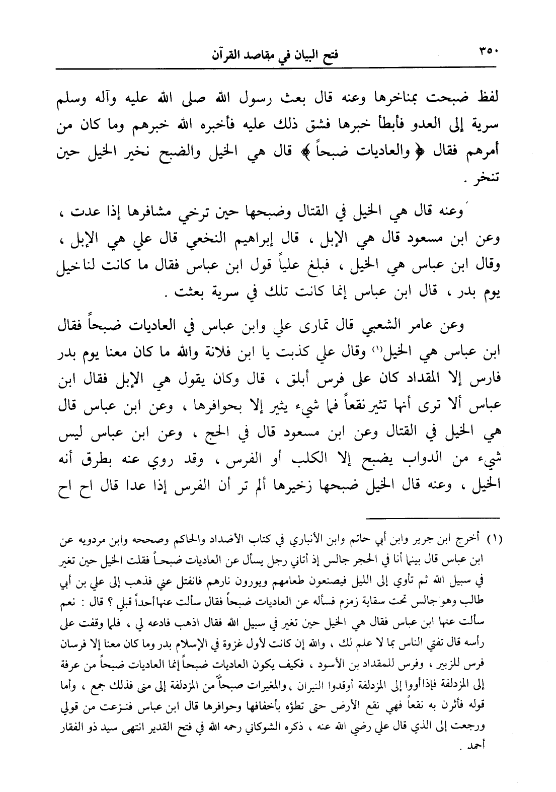 (¬1) أخرج ابن جرير وابن أبي حاتم وابن الأنباري في كتاب الأضداد والحاكم وصححه وابن مردويه عن ابن عباس قال بينما أنا في الحجر جالس إذ أتاني رجل يسأل عن العاديات ضبحاً فقلت الخيل حين تغير في سبيل الله ثم تأوي إلى الليل فيصنعون طعامهم ويورون نارهم فانفتل عني فذهب إلى علي بن أبي طالب وهو جالس تحت سقاية زمزم فسأله عن العاديات ضبحاً فقال سألت عنها أحداً قبلي؟ قال: نعم سألت عنها ابن عباس فقال هي الخيل حين تغير في سبيل الله فقال اذهب فادعه لي، فلما وقفت على رأسه قال تفتي الناس بما لا علم لك، والله إن كانت لأول غزوة في الإسلام بدر وما كان معنا إلا فرسان فرس للزبير، وفرس المقداد بن الأسود، فكيف يكون العاديات ضبحاً إنما العاديات ضبحاً من عرفة إلى المزدلفة فإذا أووا إلى المزدلفة أوقدوا النيران، والمغيرات صبحاً من المزدلفة إلى منى فذلك جمع، وأما قوله فأثرن به نقعاً فهي نقع الأرض حتى تطؤه بأخفافها وحوافرها قال ابن عباس فنزعت من قولي ورجعت إلى الذي قال علي رضي الله عنه، ذكره الشوكاني رحمه الله في فتح القدير انتهى سيد ذو الفقار أحمد.