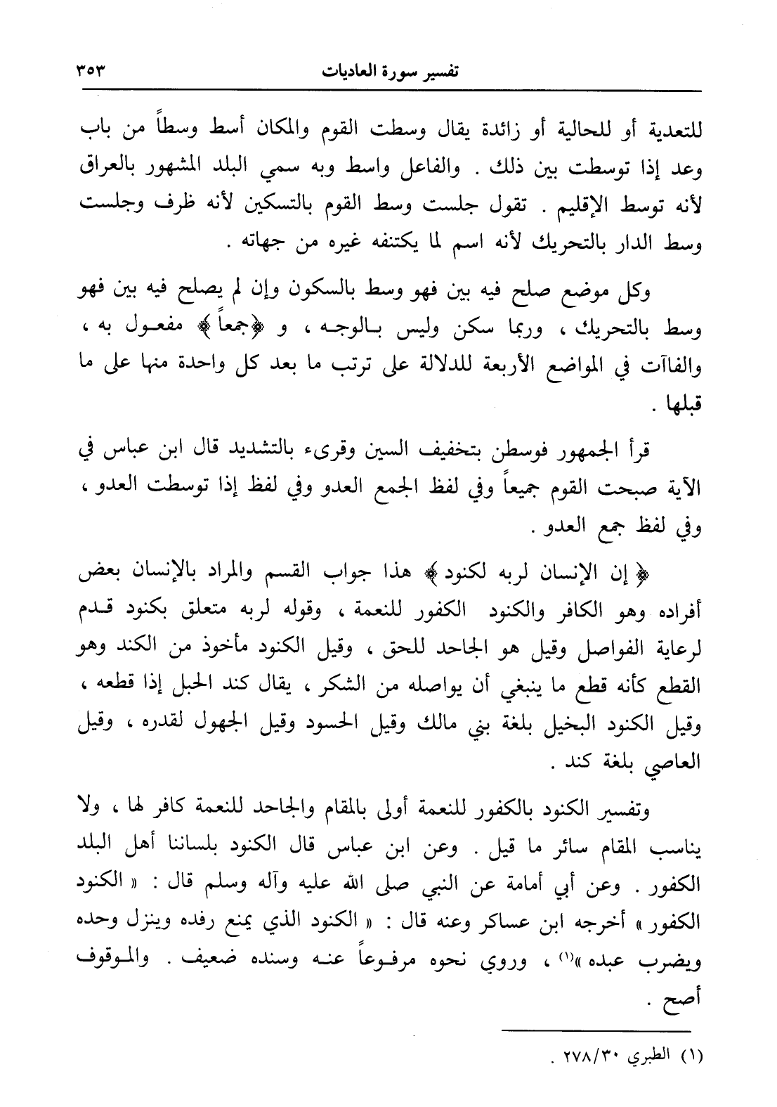 وتفسير الكنود بالكفور للنعمة أولى بالمقام والجاحد للنعمة كافر لها، ولا يناسب المقام سائر ما قيل: وعن ابن عباس قال الكنود بلساننا أهل البلد الكفور. وعن أبي أمامة عن النبي صلى الله عليه وآله وسلم قال: " الكنود الكفور " أخرجه ابن عساكر وعنه قال: " الكنود الذي يمنع رفده وينزل وحده ويضرب عبده " (¬1)، وروي نحوه مرفوعاً عنه وسنده ضعيف. والوقوف أصح.