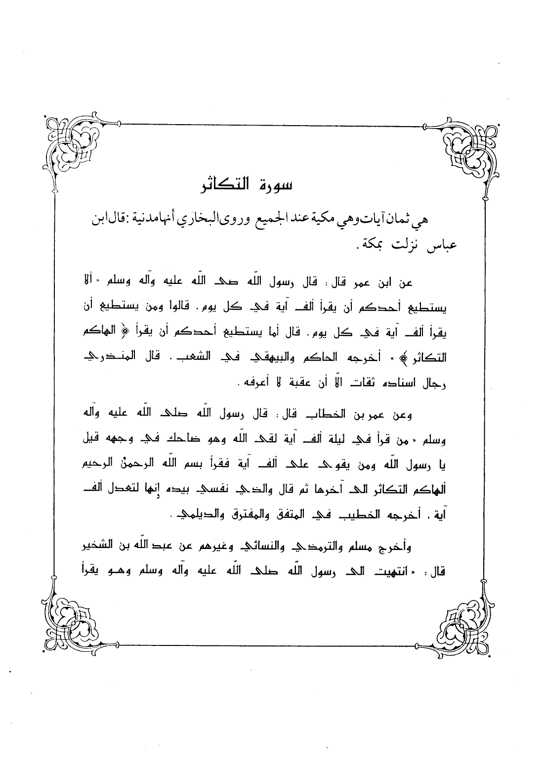 عن ابن عمر قال: قال رسول الله - صلى الله عليه وآله وسلم - " ألا يستطيع أحدكم أن يقرأ ألف آية في كل يوم "، قالوا ومن يستطيع أن يقرأ ألف آية في كل يوم، قال " أما يستطيع أحدكم أن يقرأ (أَلْهَاكُمُ التَّكَاثُرُ) " أخرجه الحاكم والبيهقي في الشعب، قال المنذري رجال إسناده ثقات إلاّ أن عقبة لا أعرفه.