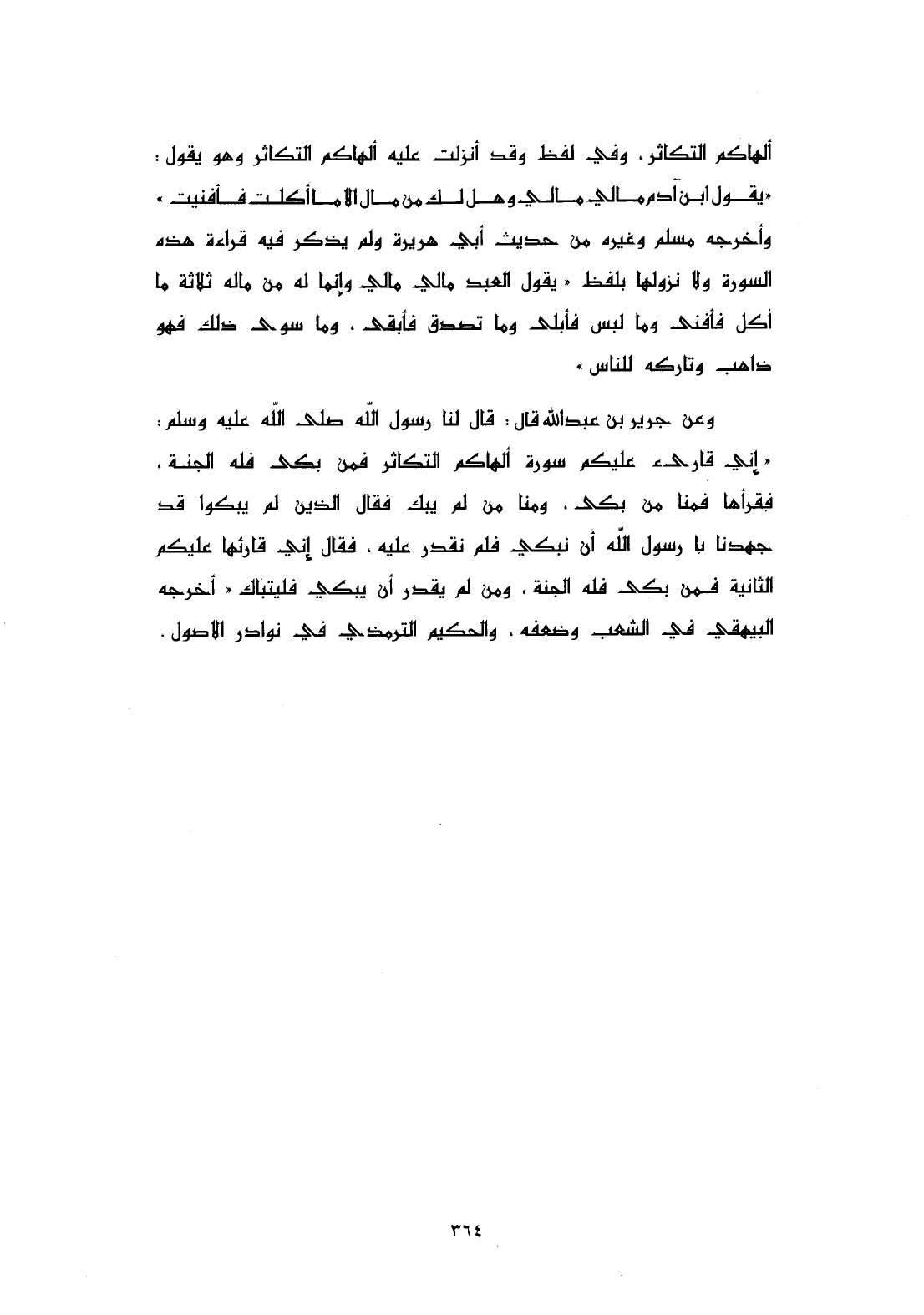 وعن جرير بن عبد الله قال: قال لنا رسول الله - صلى الله عليه وسلم -: " إني قارئ عليكم سورة (أَلْهَاكُمُ التَّكَاثُرُ) فمن بكى فله الجنة " فقرأها فمنا من بكى، ومنا من لم يبك فقال الذين لم يبكوا قد جهدنا يا رسول الله أن نبكي فلم نقدر عليه، فقال " إني قارئها عليكم الثانية فمن بكى فله الجنة، ومن لم يقدر أن يبكي فليتباك " أخرجه البيهقي في الشعب وضعفه، والحكيم الترمذي في نوادر الأصول.