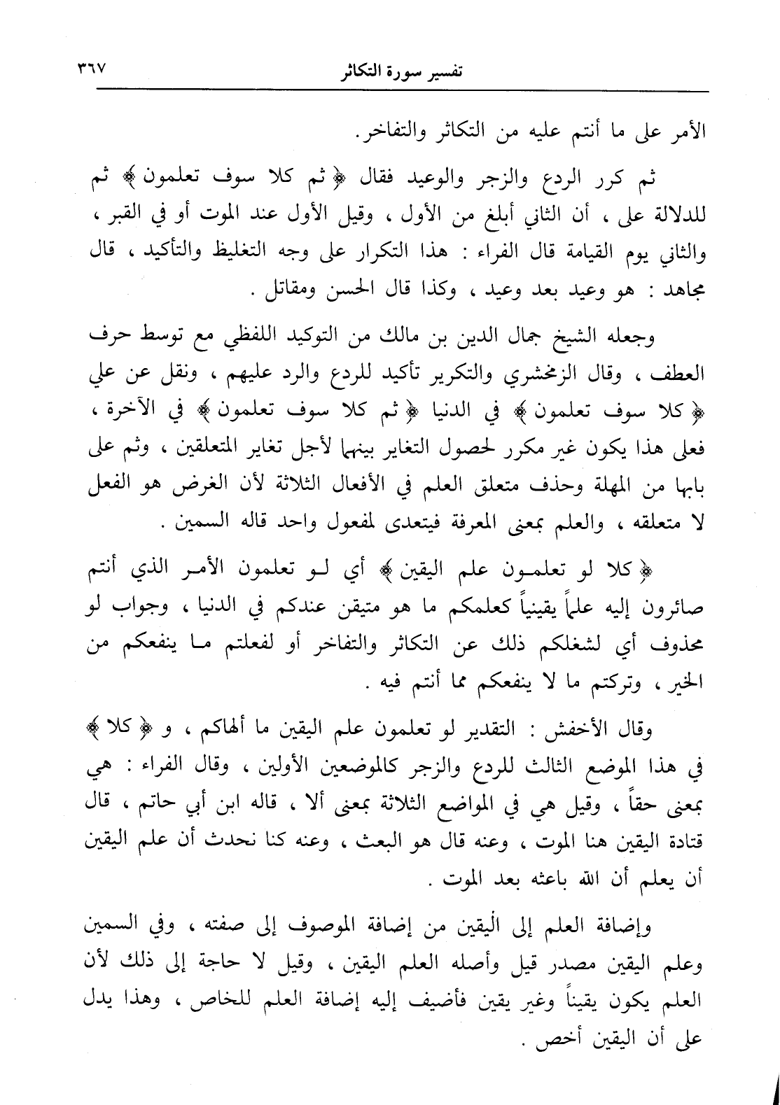 وجعله الشيخ جمال الدين بن مالك من التوكيد اللفظي مع توسط حرف العطف، وقال الزمخشري والتكرير تأكيد للردع والرد عليهم، ونقل عن علي (كلا سوف تعلمون) في الدنيا (ثم كلا سوف تعلمون) في الآخرة، فعلى هذا يكون غير مكرر لحصول التغاير بينهما لأجل تغاير المتعلقين، وثم على بابها من المهلة وحذف متعلق العلم في الأفعال الثلاثة لأن الغرض هو الفعل لا متعلقه، والعلم بمعنى المعرفة فيتعدى لمفعول واحد قاله السمين.