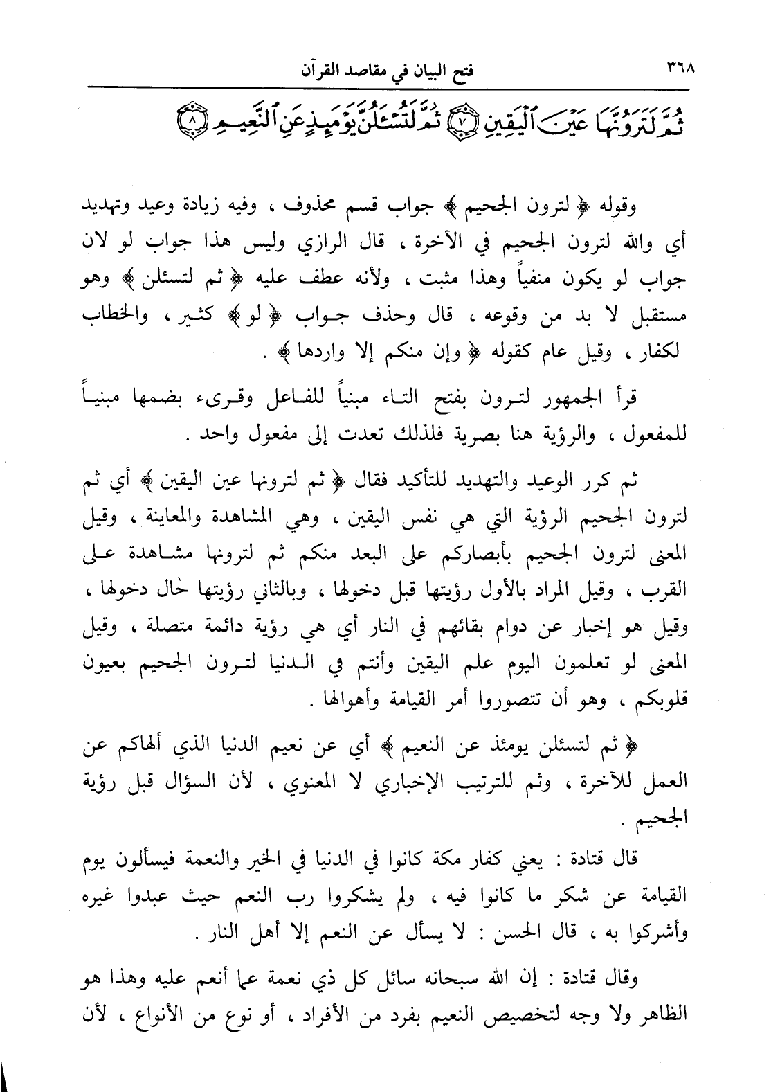 (ثم لتسئلن يومئذ عن النعيم) أي عن نعيم الدنيا الذي ألهاكم عن العمل للآخرة، وثم للترتيب الإخباري لا المعنوي، لأن السؤال قبل رؤية الجحيم.