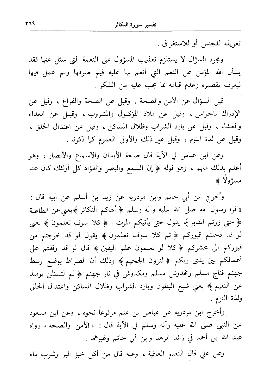 وأخرج ابن أبي حاتم وابن مردويه عن زيد بن أسلم عن أبيه قال: " قرأ رسول الله صلى الله عليه وآله وسلم (ألهاكم التكاثر) يعني عن الطاعة (حتى زرتم المقابر) يقول حتى يأتيكم الموت " (كلا سوف تعلمون) يعني لو قد دخلتم قبوركم (ثم كلا سوف تعلمون) يقول لو قد خرجتم من قبوركم إلى محشركم (كلا لو تعلمون علم اليقين) قال لو قد وقفتم على أعمالكم بين يدي ربكم (لترون الجحيم) وذلك أن الصراط يوضع وسط جهنم فناج مسلم ومخدوش مسلم ومكدوش في نار جهنم (ثم لتسئلن يومئذ عن النعيم) يعني شبع البطون وبارد الشراب وظلال المساكن واعتدال الخلق ولذة النوم.