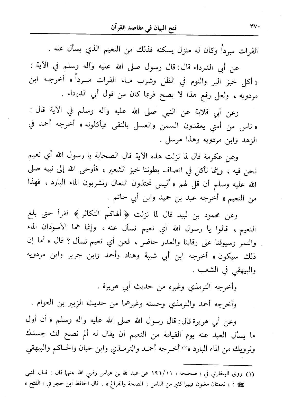وعن محمود بن لبيد قال لما نزلت (ألهاكم التكاثر) فقرأ حتى بلغ النعيم، قالوا يا رسول الله أي نعيم نسأل عنه، وإنما هما الأسودان الماء والتمر وسيوفنا على رقابنا والعدو حاضر، فعن أي نعيم نسأل؟ قال " أما إن ذلك سيكون " أخرجه ابن أبي شيبة وهناد وأحمد وابن جرير وابن مردويه والبيهقي في الشعب.