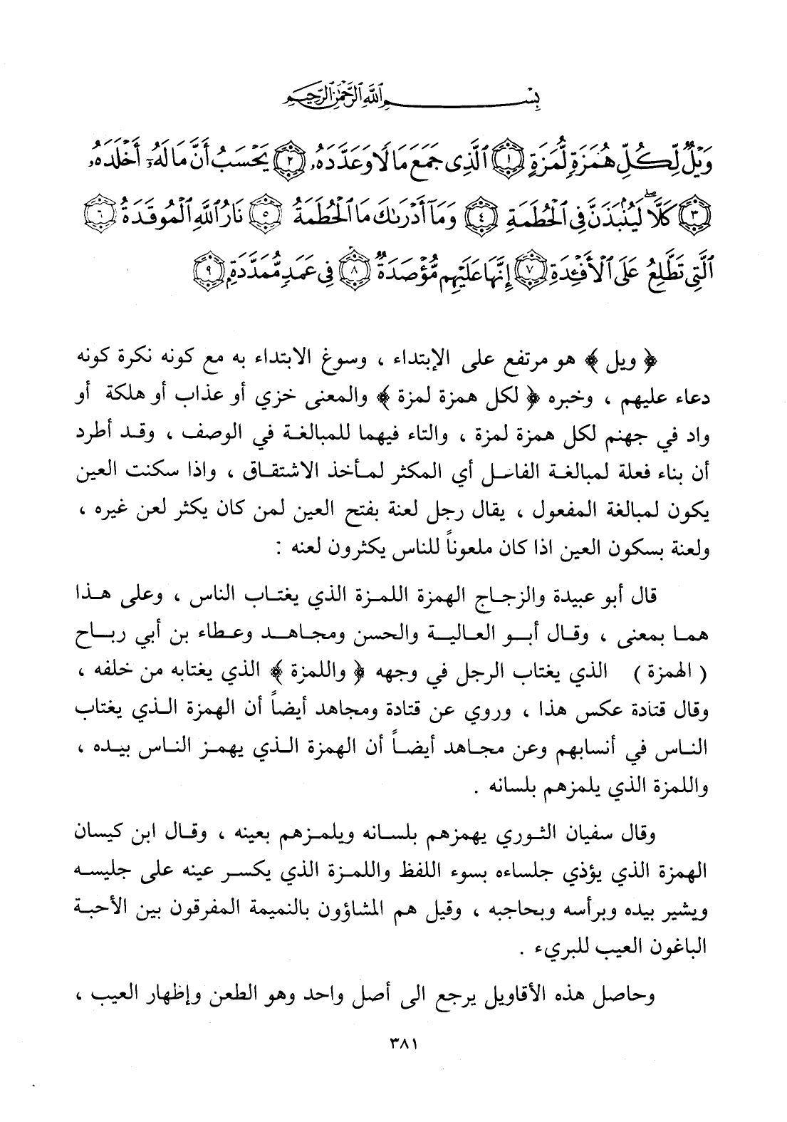 (ويل) هو مرتفع على الإبتداء، وسوغ الابتداء به مع كونه نكرة كونه دعاء عليهم، وخبره (لكل همزة لمزة) والمعنى خزي أو عذاب أو هلكة أو واد في جهنم لكل همزة لمزة، والتاء فيهما للمبالغة في الوصف، وقد أطرد أن بناء فعلة لمبالغة الفاعل أي المكثر لمأخذ الاشتقاق، وإذا سكنت العين يكون لمبالغة المفعول، يقال رجل لعنة بفتح العين لمن كان يكثر لعن غيره، ولعنة بسكون العين إذا كان ملعوناً للناس يكثرون لعنه: