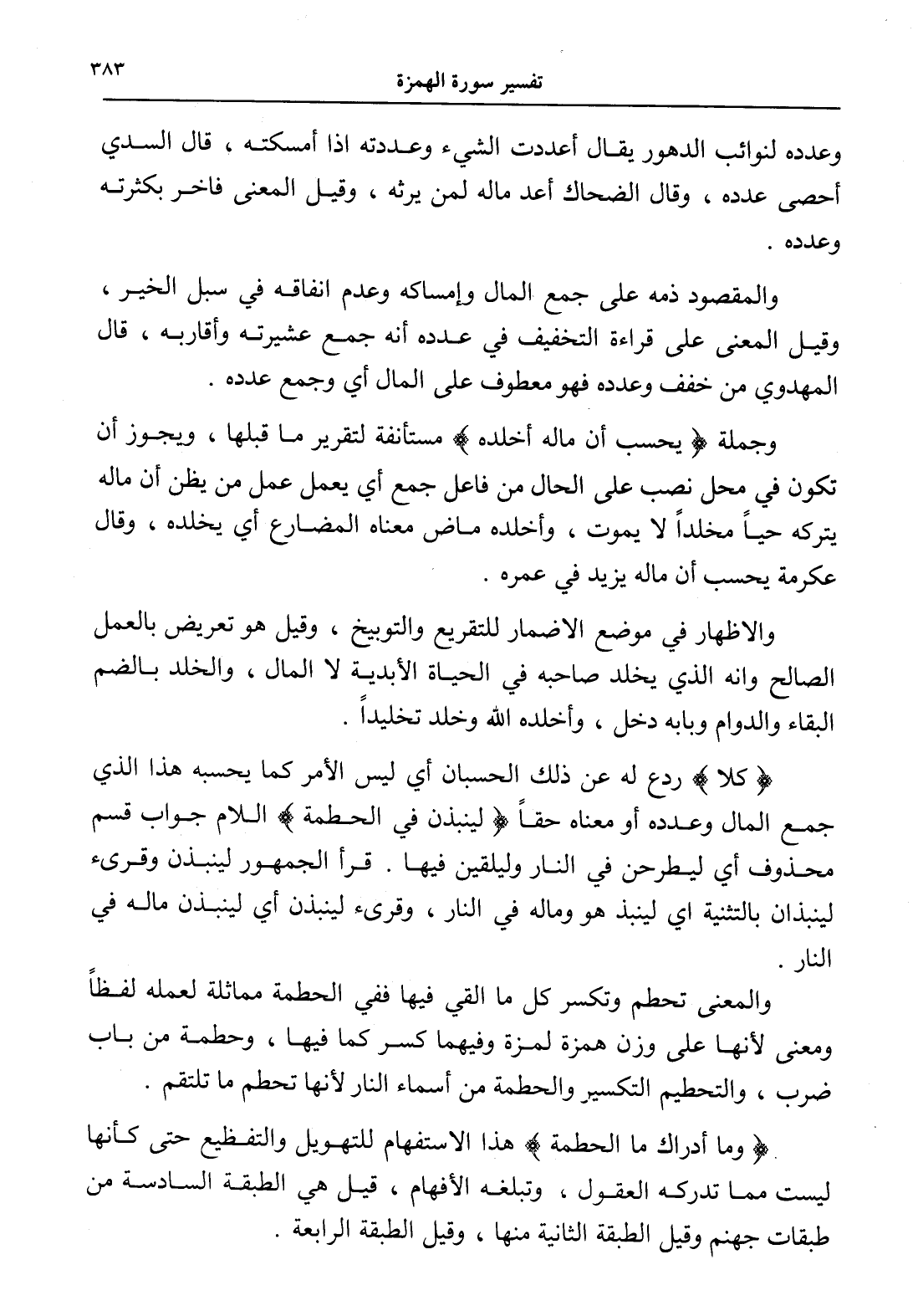 (كلا) ردع له عن ذلك الحسبان أي ليس الأمر كما يحسبه هذا الذي جمع المال وعدده أو معناه حقاً (لينبذن في الحطمة) اللام جواب قسم محذوف أي ليطرحن في النار وليلقين فيها. قرأ الجمهور لينبذن وقرىء لينبذان بالتثنية أي لينبذ هو وماله في النار، وقرىء لينبذن أي لينبذن ماله في النار.