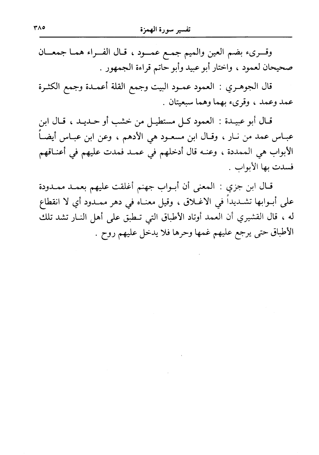 قال أبو عبيدة: العمود كل مستطيل من خشب أو حديد، قال ابن عباس عمد من نار، وقال ابن مسعود هي الأدهم، وعن ابن عباس أيضاًً الأبواب هي الممددة، وعنه قال أدخلهم في عمد فمدت عليهم في أعناقهم فسدت بها الأبواب.