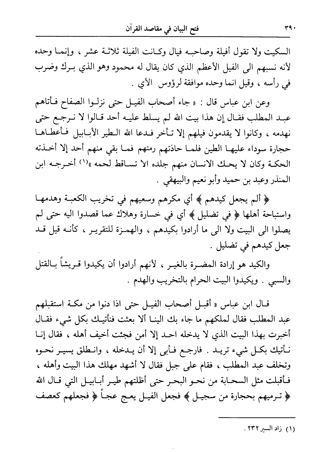 وعن ابن عباس قال: " جاء أصحاب الفيل حتى نزلوا الصفاح فأتاهم عبد المطلب فقال إن هذا بيت الله لم يسلط عليه أحد قالوا لا نرجع حتى نهدمه، وكانوا لا يقدمون فيلهم إلا تأخر فدعا الله الطير الأبابيل فأعطاها حجارة سوداء عليها الطين فلما حاذتهم رمتهم فما بقي منهم أحد إلا أخذته الحكة وكان لا يحك الإنسان منهم جلده إلا تساقط لحمه " (¬1) أخرجه ابن المنذر وعبد بن حميد وأبو نعيم والبيهقي.