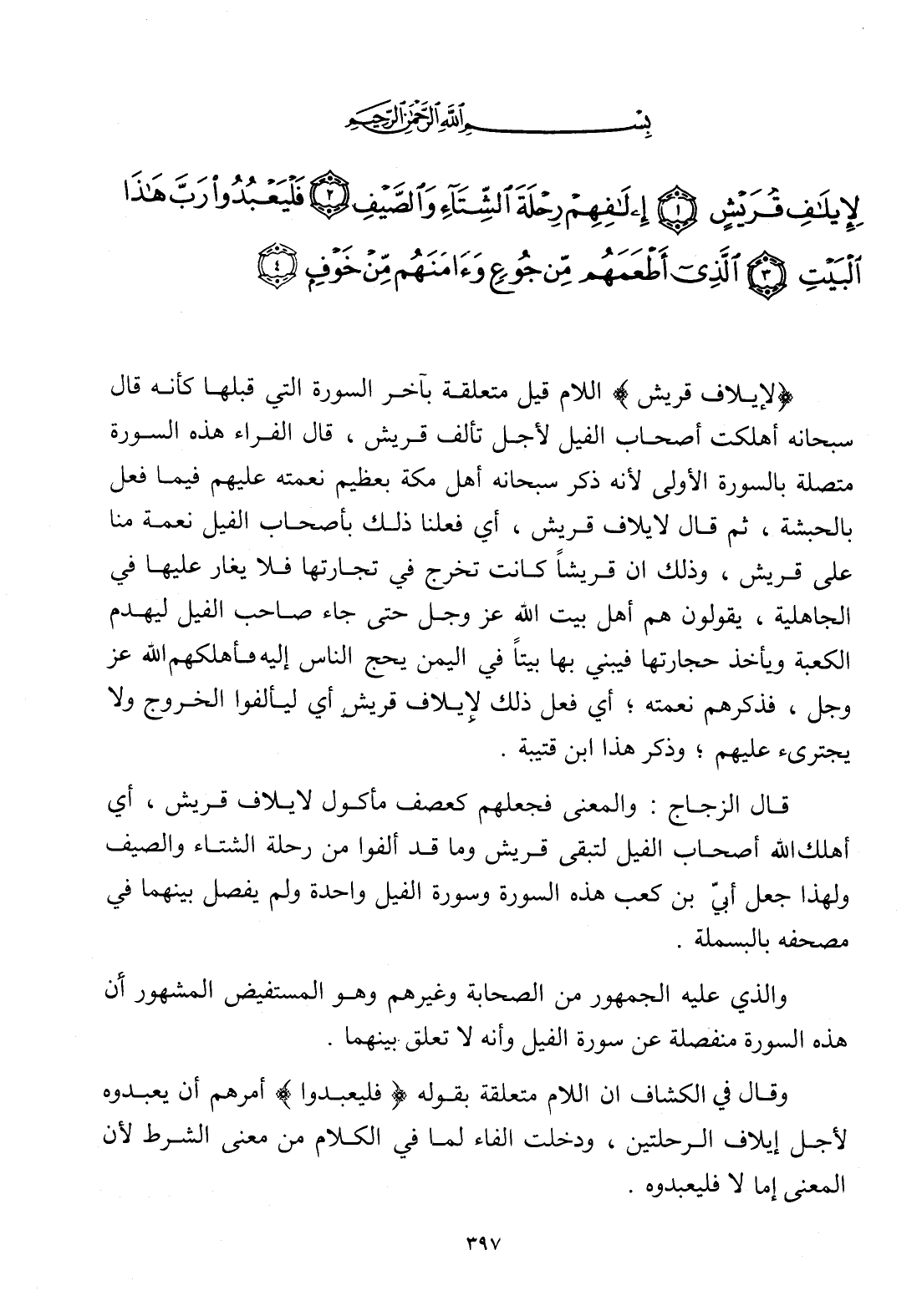 قال الزجاج: والمعنى فجعلهم كعصف مأكول لإيلاف قريش، أي أهلك الله أصحاب الفيل لتبقى قريش وما قد ألفوا من رحلة الشتاء والصيف ولهذا جعل أبيّ بن كعب هذه السورة وسورة الفيل واحدة ولم يفصل بينهما في مصحفه بالبسملة.