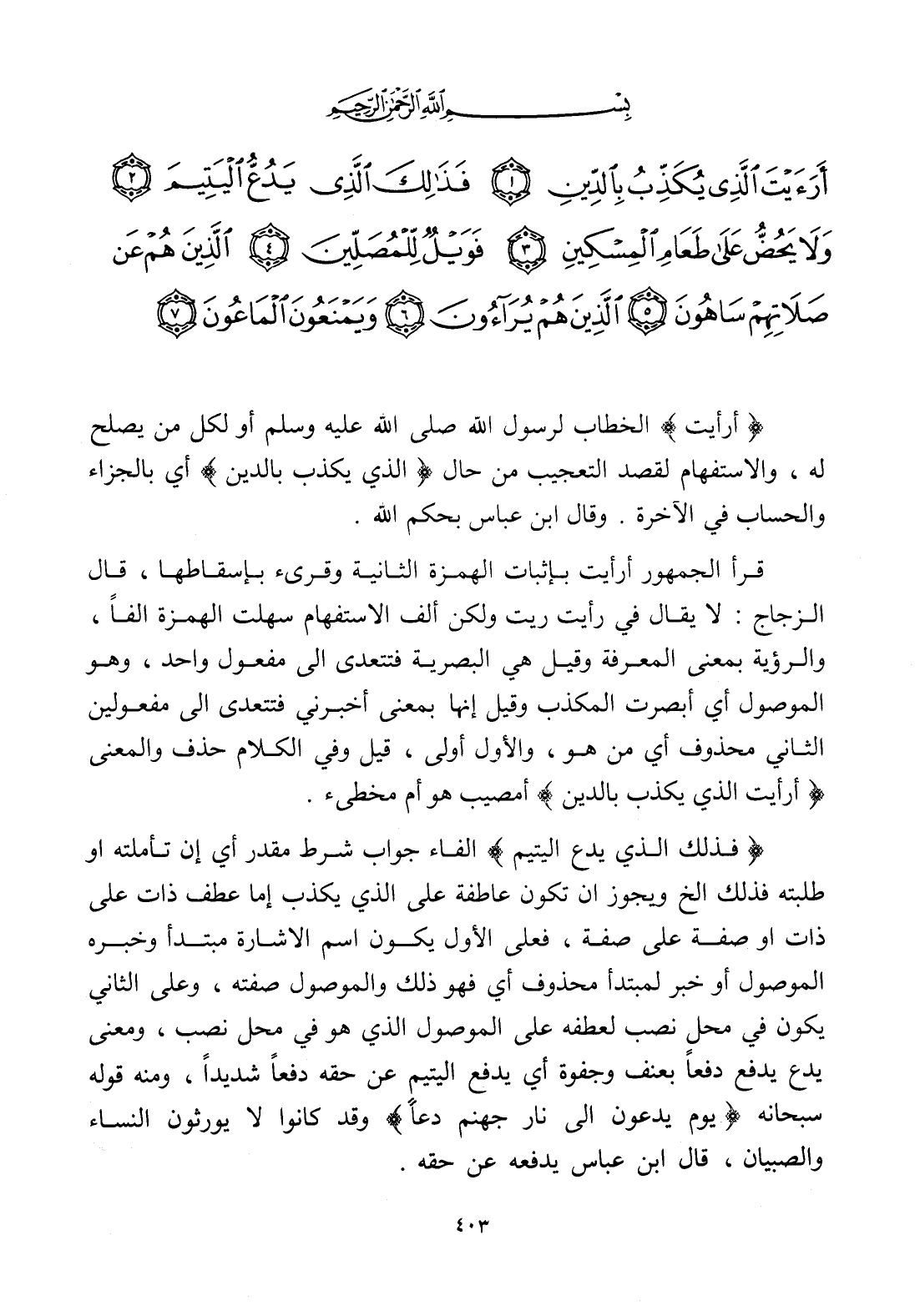أَرَأَيْتَ الَّذِي يُكَذِّبُ بِالدِّينِ (1) فَذَلِكَ الَّذِي يَدُعُّ الْيَتِيمَ (2) وَلَا يَحُضُّ عَلَى طَعَامِ الْمِسْكِينِ (3) فَوَيْلٌ لِلْمُصَلِّينَ (4) الَّذِينَ هُمْ عَنْ صَلَاتِهِمْ سَاهُونَ (5) الَّذِينَ هُمْ يُرَاءُونَ (6) وَيَمْنَعُونَ الْمَاعُونَ (7)