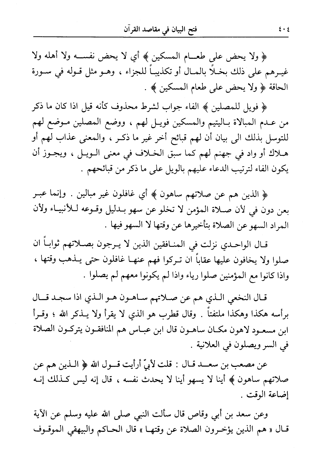 عن مصعب بن سعد قال: قلت لأبيّ أرأيت قول الله (الذين هم عن صلاتهم ساهون) أينا لا يسهو أينا لا يحدث نفسه، قال إنه ليس كذلك إنه إضاعة الوقت.