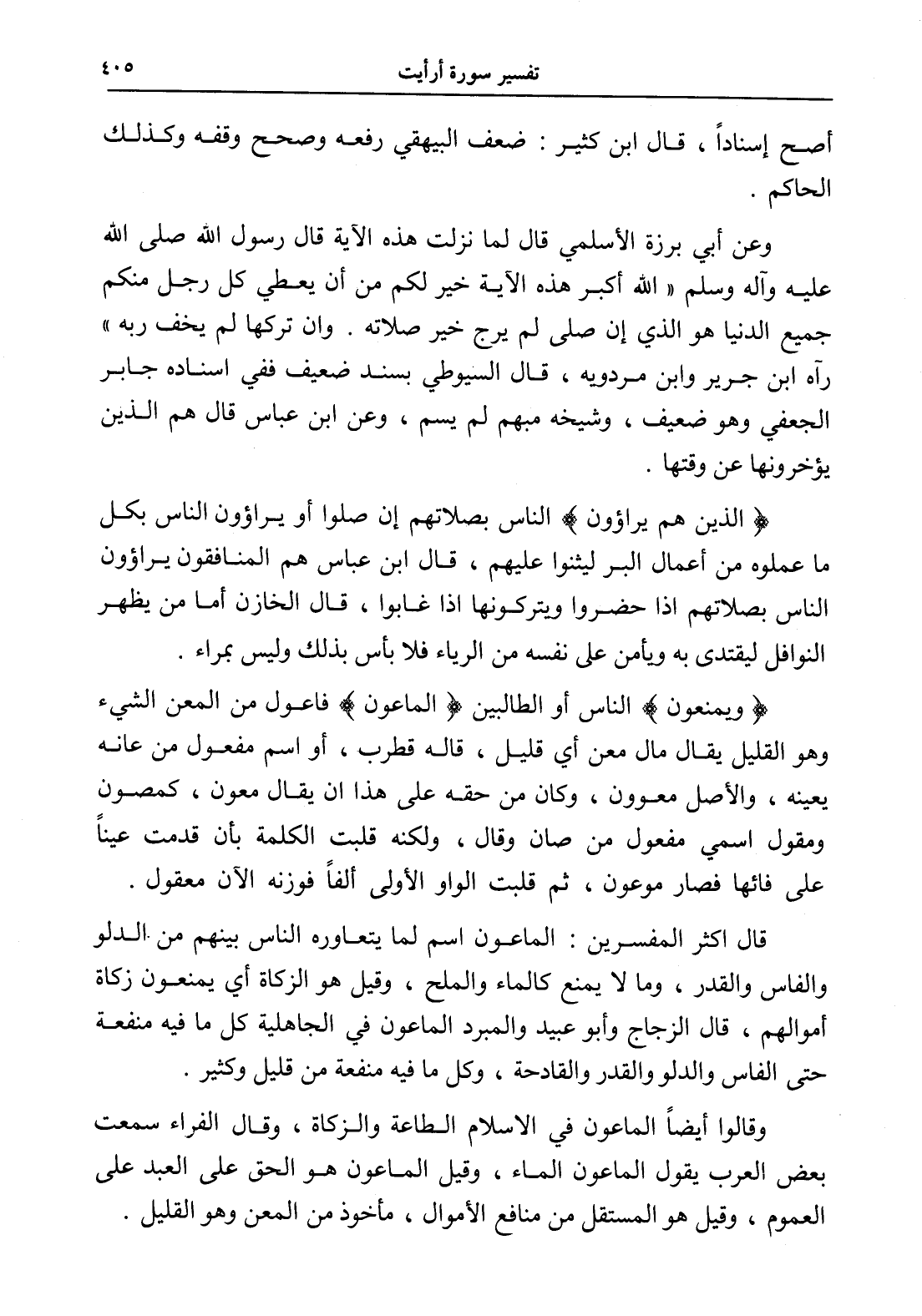 وعن أبي برزة الأسلمي قال لما نزلت هذه الآية قال رسول الله صلى الله عليه وآله وسلم " الله أكبر هذه الآية خير لكم من أن يعطي كل رجل منكم جميع الدنيا هو الذي إن صلى لم يرج خير صلاته. وإن تركها لم يخف ربه " رآه ابن جرير وابن مردويه، قال السيوطي بسند ضعيف ففي إسناده جابر الجعفي وهو ضعيف، وشيخه مبهم لم يسم، وعن ابن عباس قال هم الذين يؤخرونها عن وقتها.