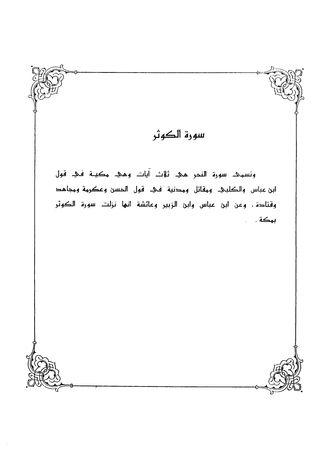 وتسمى سورة النحر هي ثلاث آيات وهي مكية في قول ابن عباس والكلبي ومقاتل ومدنية في قول الحسن وعكرمة ومجاهد وقتادة، وعن ابن عباس وابن الزبير وعائشة أنها نزلت سورة الكوثر بمكة.