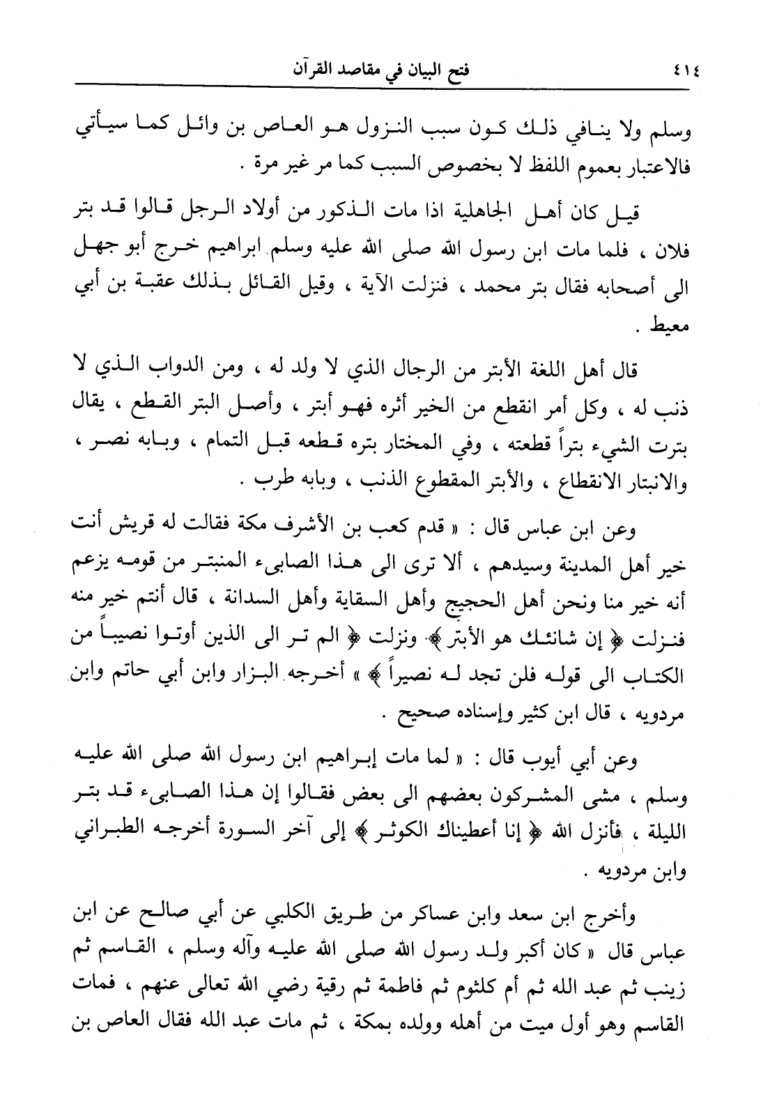 وعن ابن عباس قال: " قدم كعب بن الأشرف مكة فقالت له قريش أنت خير أهل المدينة وسيدهم، ألا ترى إلى هذا الصابيء المنبتر من قومه يزعم أنه خير منا ونحن أهل الحجيج وأهل السقاية وأهل السدانة، قال أنتم خير منه فنزلت (إِنَّ شَانِئَكَ هُوَ الْأَبْتَرُ)، ونزلت (أَلَمْ تَرَ إِلَى الَّذِينَ أُوتُوا نَصِيبًا مِنَ الْكِتَابِ -إلى قوله- فَلَنْ تَجِدَ لَهُ نَصِيرًا) " أخرجه البزار وابن أبي حاتم وابن مردويه، قال ابن كثير وإسناده صحيح.