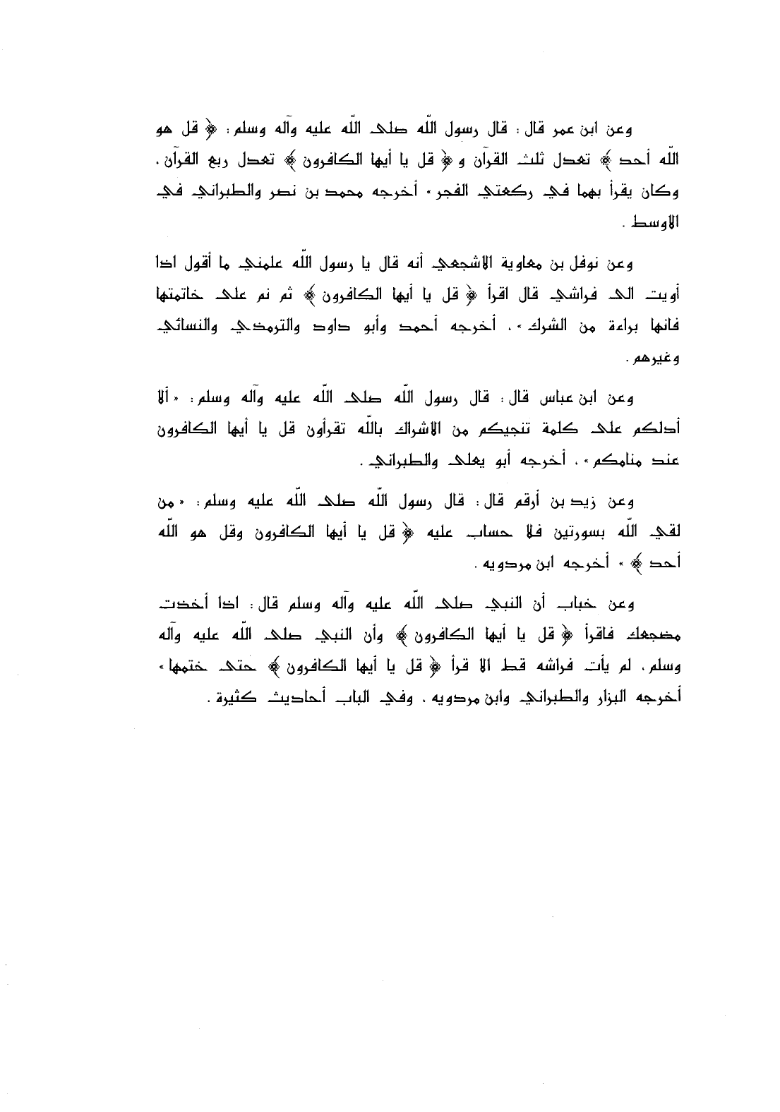 وعن ابن عمر قال: قال رسول الله - صلى الله عليه وآله وسلم -: (قُلْ هُوَ اللَّهُ أَحَدٌ) تعدل ثلث القرآن و (قُلْ يَا أَيُّهَا الْكَافِرُونَ) تعدل ربع القرآن، وكان يقرأ بهما في ركعتي الفجر " أخرجه محمد بن نصر والطبراني في الأوسط.