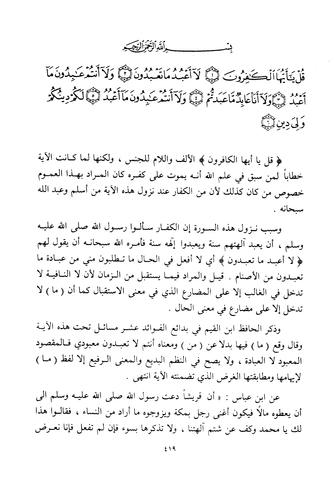 قُلْ يَا أَيُّهَا الْكَافِرُونَ (1) لَا أَعْبُدُ مَا تَعْبُدُونَ (2) وَلَا أَنْتُمْ عَابِدُونَ مَا أَعْبُدُ (3) وَلَا أَنَا عَابِدٌ مَا عَبَدْتُمْ (4) وَلَا أَنْتُمْ عَابِدُونَ مَا أَعْبُدُ (5) لَكُمْ دِينُكُمْ وَلِيَ دِينِ (6)
