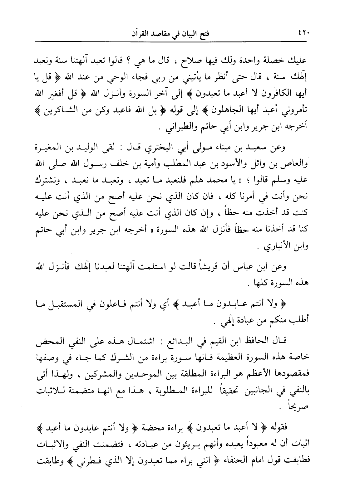 فقوله (لا أعبد ما تعبدون) براءة محضة (ولا أنتم عابدون ما أعبد) إثبات أن له معبوداً يعبده وأنهم بريئون من عبادته، فتضمنت النفي والإثبات فطابقت قول إمام الحنفاء (إنني براء مما تعبدون إلا الذي فطرني) وطابقت