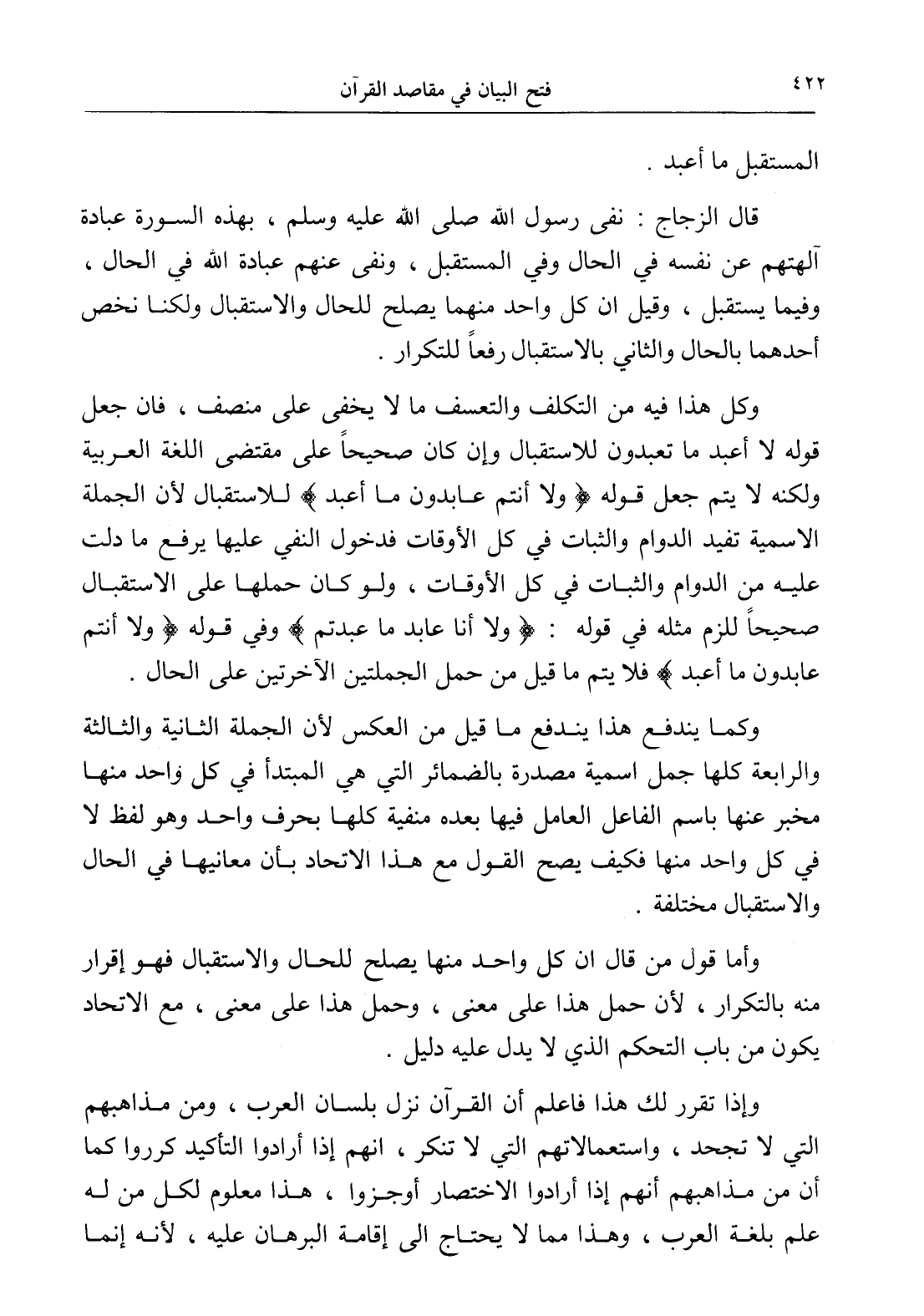 وكل هذا فيه من التكلف والتعسف ما لا يخفى على منصف، فإن جعل قوله لا أعبد ما تعبدون للإستقبال وإن كان صحيحاً على مقتضى اللغة العربية ولكنه لا يتم جعل قوله
