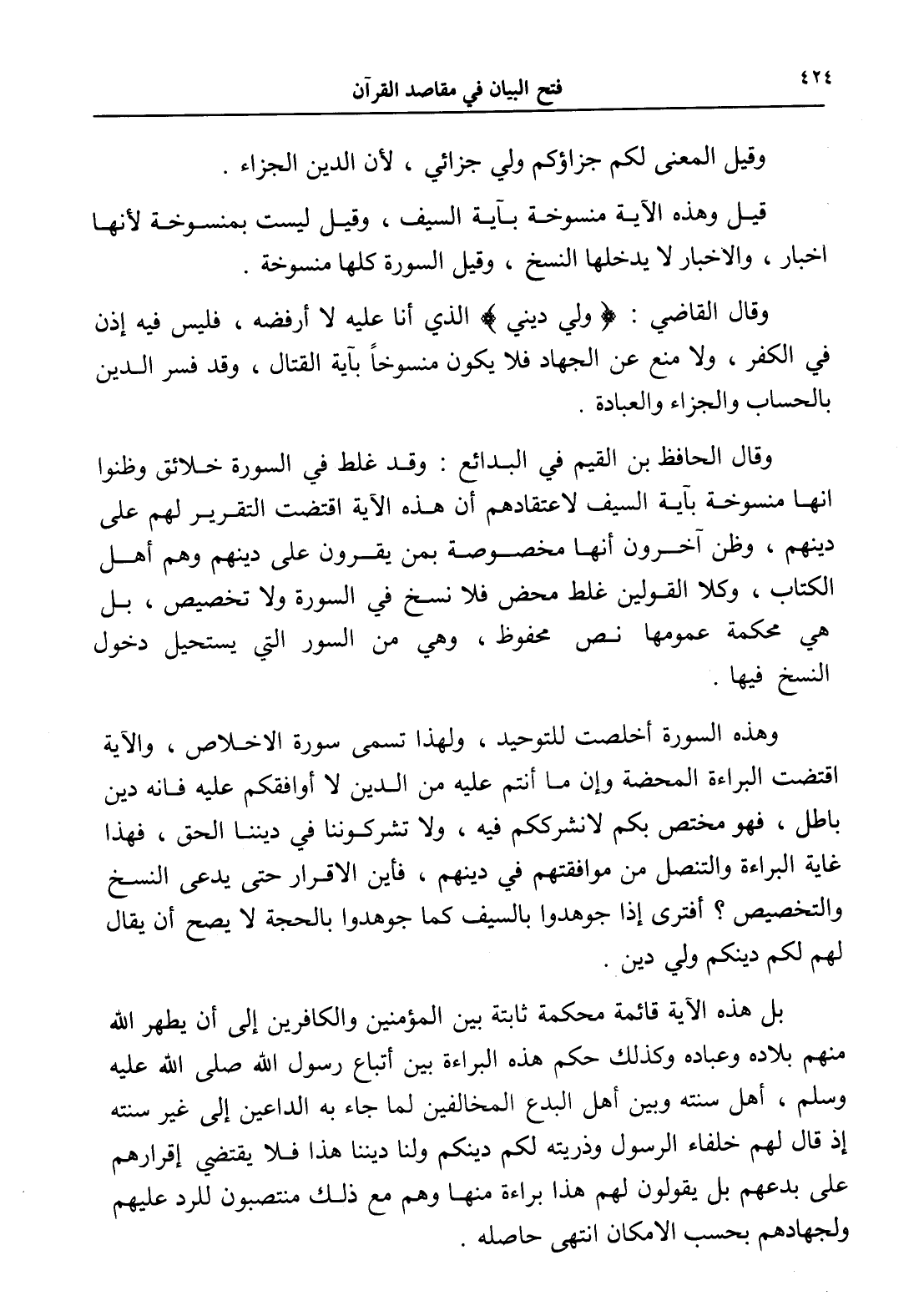 وهذه السورة أخلصت للتوحيد، ولهذا تسمى سورة الإخلاص، والآية اقتضت البراءة المحضة وإن ما أنتم عليه من الدين لا أوافقكم عليه فإنه دين باطل، فهو مختص بكم لا نشرككم فيه، ولا تشركوننا في ديننا الحق، فهذا غاية البراءة والتنصل من موافقتهم في دينهم، فأين الإقرار حتى يدعى النسخ والتخصيص؟ أفترى إذا جوهدوا بالسيف كما جوهدوا بالحجة لا يصح أن يقال لهم لكم دينكم ولي دين.