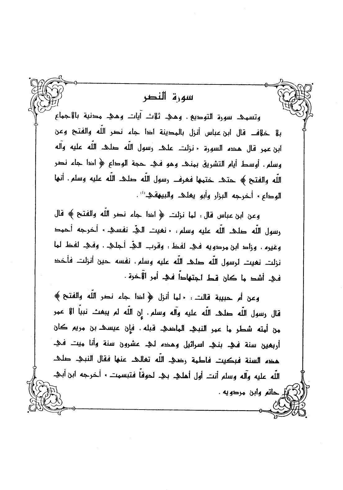 وتسمى سورة التوديع، وهي ثلاث آيات وهي مدنية بالإجماع بلا خلاف قال ابن عباس أنزل بالمدينة إذا جاء نصر الله والفتح وعن ابن عمر قال هذه السورة " نزلت على رسول الله - صلى الله عليه وآله وسلم - أوسط أيام التشريق بمنى وهو في حجة الوداع (إِذَا جَاءَ نَصْرُ اللَّهِ وَالْفَتْحُ) حتى ختمها فعرف رسول الله - صلى الله عليه وسلم - أنها الوداع " أخرجه البزار وأبو يعلى والبيهقي (¬1).