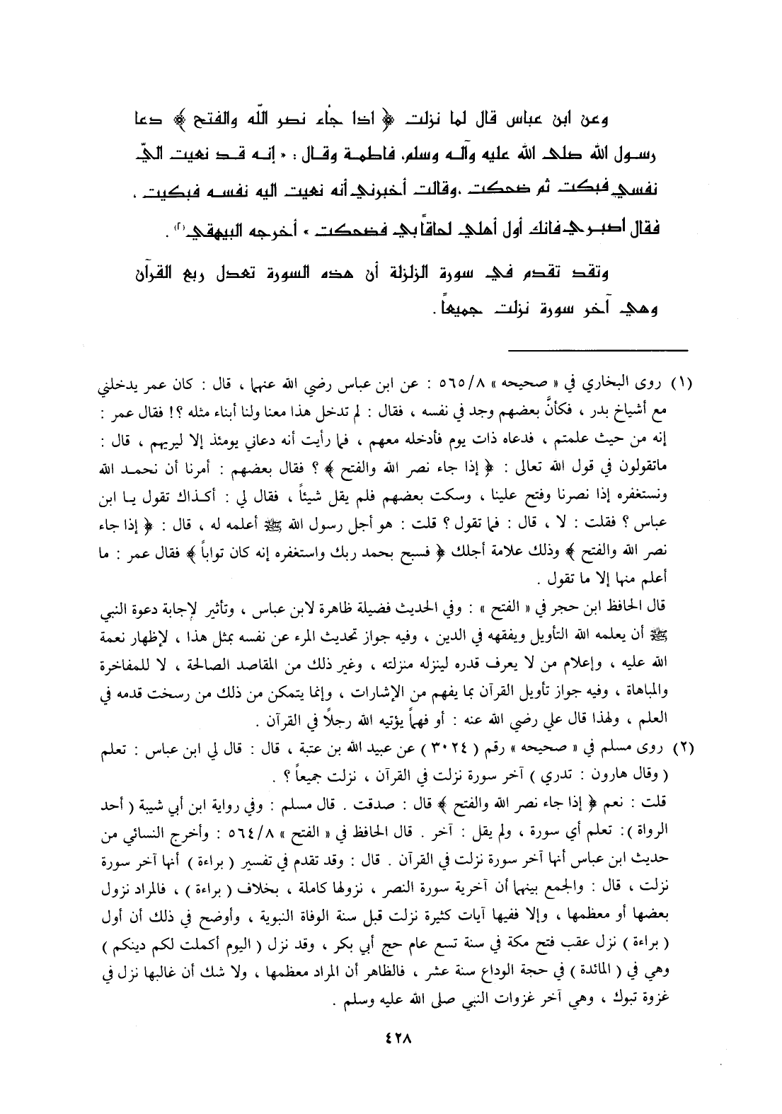 وعن ابن عباس قال لما نزلت (إِذَا جَاءَ نَصْرُ اللَّهِ وَالْفَتْحُ) دعا رسول الله - صلى الله عليه وآله وسلم - فاطمة وقال: " إنه قد نعيت إليّ نفسي فبكت ثم ضحكت، وقالت أخبرني أنه نعيت إليه نفسي فبكيت، فقال اصبري فإنك أول أهلي لحاقاً بي فضحكت " أخرجه البيهقي " (¬1).