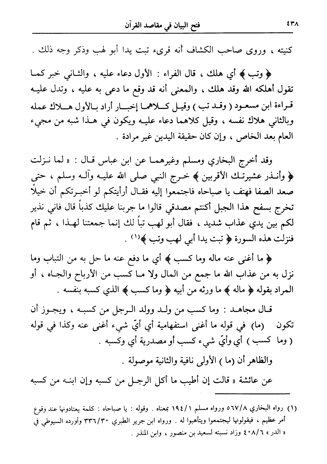 (¬1) رواه البخاري 8/ 567 ورواه مسلم 1/ 194 بمعناه. وقوله: يا صباحاه: كلمة يعتادونها عند وقوع أمر عظيم، فيقولونها ليجتمعوا ويتأهبوا له. ورواه ابن جرير الطبري 30/ 336 وأورده السيوطي في " الدر " 6/ 408 وزاد نسبته لسعيد بن منصور، وابن المنذر.
