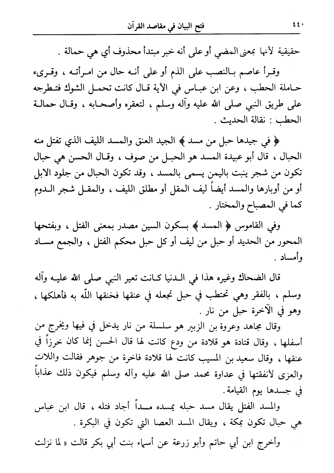 (في جيدها حبل من مسد) الجيد العنق والمسد الليف الذي تفتل منه الحبال، قال أبو عبيدة المسد هو الحبل من صوف، وقال الحسن هي حبال تكون من شجر ينبت باليمن يسمى بالمسد، وقد تكون الحبال من جلود الإبل أو من أوبارها والمسد أيضاًً ليف المقل أو مطلق الليف، والمقل شجر الدوم كما في المصباح والمختار.