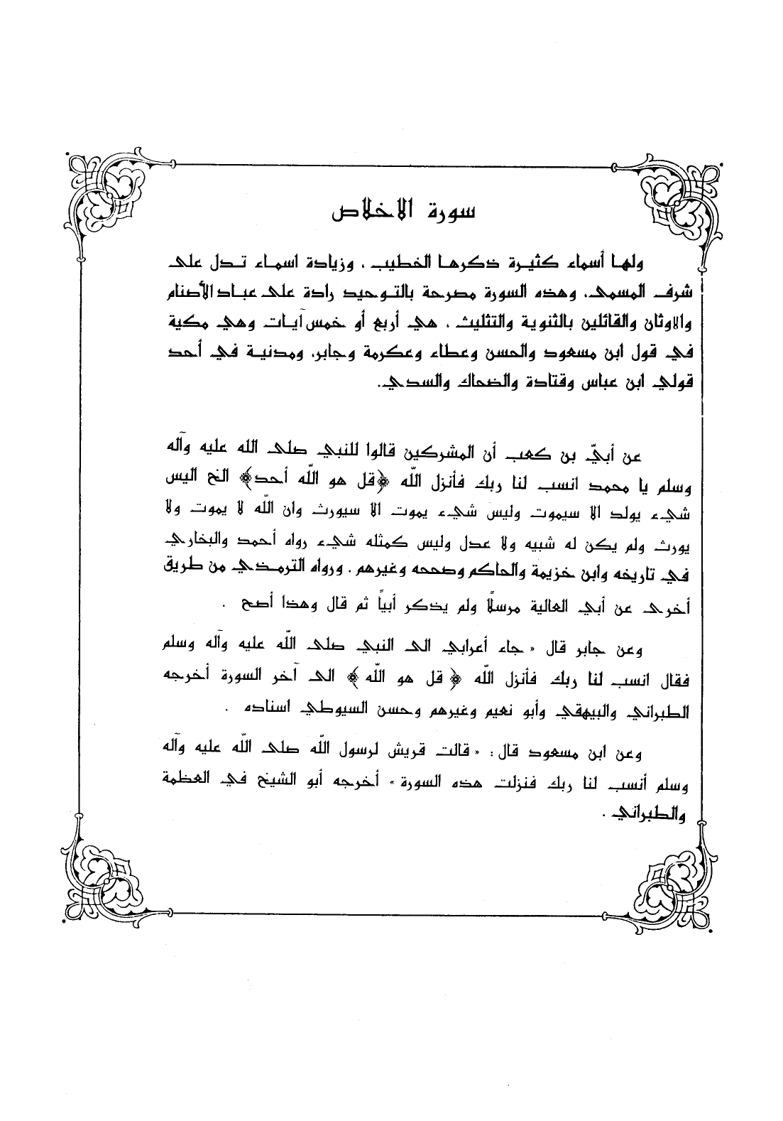وعن جابر قال: جاء أعرابي إلى النبي - صلى الله عليه وآله وسلم - فقال انسب لنا ربك فأنزل الله (قُلْ هُوَ اللَّهُ أَحَدٌ) إلى آخر السورة أخرجه الطبراني والبيهقي وأبو نعيم وغيرهم وحسن السيوطي إسناده (¬1).
