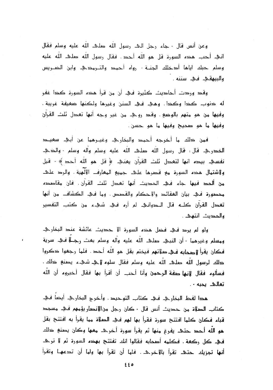 (¬2) رواه البخاري في " صحيحه " 6/ 105 باب فضل (قُلْ هُوَ اللَّهُ أَحَدٌ) ولفظه بتمامه: عن أبي سعيد الخدري - رضي الله عنه - أنه سمع رجلاً يقرأ (قُلْ هُوَ اللَّهُ أَحَدٌ) يردِّدها، فلما أصبح جاء إلى رسول الله - صلى الله عليه وسلم - فذكر ذلك له، وكأن الرجل يتقالُها، فقال رسول الله - صلى الله عليه وسلم -: " والذي نفسي بيده، إنها لتعدل ثلث القرآن ".