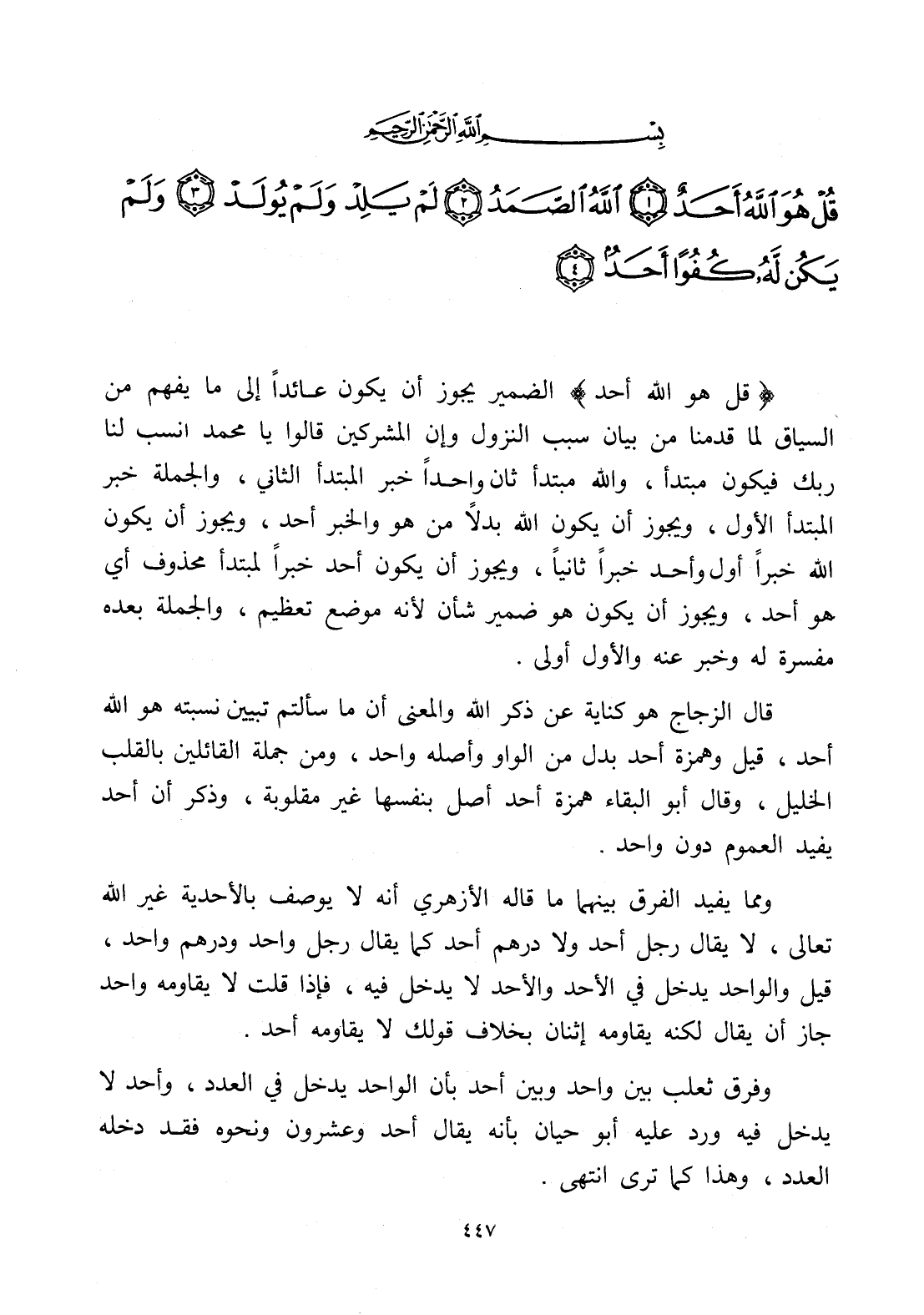 قُلْ هُوَ اللَّهُ أَحَدٌ (1) اللَّهُ الصَّمَدُ (2) لَمْ يَلِدْ وَلَمْ يُولَدْ (3) وَلَمْ يَكُنْ لَهُ كُفُوًا أَحَدٌ (4)