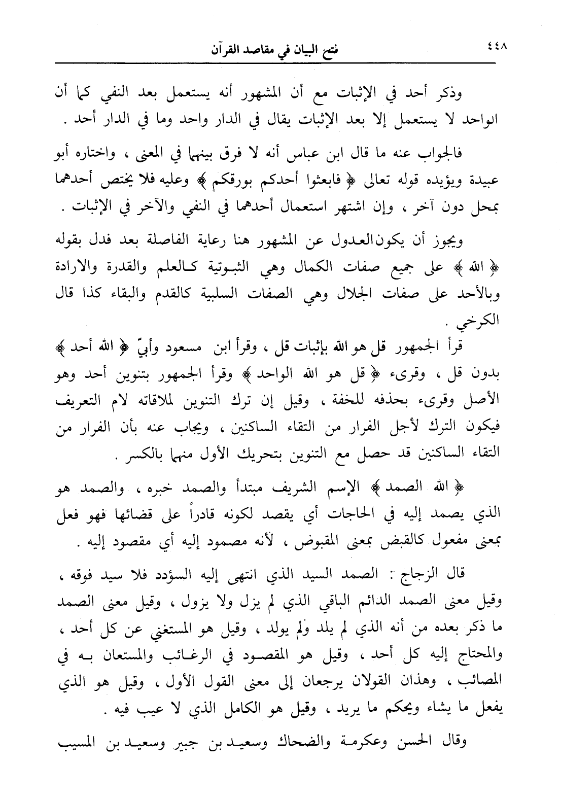 ويجوز أن يكون العدول عن المشهور هنا رعاية الفاصلة بعد فدل بقوله (الله) على جميع صفات الكمال وهي الثبوتية كالعلم والقدرة والإرادة وبالأحد على صفات الجلال وهي الصفات السلبية كالقدم والبقاء كذا قال الكرخي.