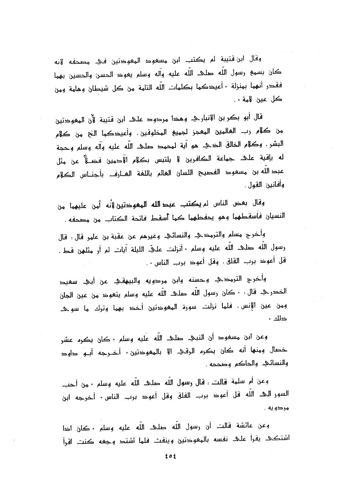 وقال ابن قتيبة لم يكتب ابن مسعود المعوذتين في مصحفه لأنه كان يسمع رسول الله - صلى الله عليه وسلم - يعوذ الحسن والحسين بهما فقدر أنهما بمنزلة " أعيذكما بكلمات الله التامة من كل شيطان وهامة ومن كل عين لامة ".
